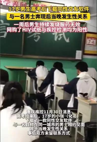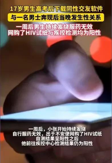 重庆,17岁男生高考完,就下载了一个同性交友软件,就认识了一名同城男子,两人见面奔现,当晚,两人就发生了不正当的关系,结果1周后,男生一直发烧,吃药也没有用,他赶紧买了试纸检测,结果发现艾滋病阳性,他到了疾控去检测,也是同样的结果,他看着重点大学录取通知书的那一刻,他崩溃了。 17岁的小张(化名),他看着手中的重点大学录取通知书,那一刻,他没有激动,他内心五味杂陈,后悔,难受,痛苦的情绪在他的内心翻滚着,让他疲惫不堪。 这一刻,他真的是后悔莫及。 如果他洁身自好,如果他不乱来,如果没有那一件事,他的人生一片光明。 可如今,他的人生被这一件事给毁了。 17岁的他,高考完的那一刻,所有的压力一泻万里,却没有出口,让他迷茫不知所措。 没有了紧张的学习,没有了如山般的压力,那个暑假更没有了目的,他睡了几天的昏天暗地,开始不甘心这样迷茫不知所措的日子。 于是他决定尝试一点刺激的经历,这个经历,他敢说,没有人敢于轻易尝试,当然他也不会告诉自己的家人,他是偷偷地下载了同性交友软件。 当他看到里面一个个英俊阳光的男子,退却了青春的羞涩,多了一份成年男子的魅力,小张感到心砰砰直跳。 他找了一位心仪的男子,和他聊了起来,果然和他有同样需求的男子,他们相谈甚欢,他们越聊越兴奋。 男子告诉小张,他们是同城,如果要见面奔现,他随时可约。 小张激动,兴奋,期待,小鹿一直乱撞,他决定和这名男子见面。 两人见面,一切水到渠成,当天晚上两人就开了房,发生了不正当的关系。 事后小张意识到,这并不是光彩的经历,事情结束后,他反而有些后悔认识这名男子了,当时双方就没有留联系方式。 这样的经历,有一次就够了,小张在事情结束后,就没把这件事当回事,只想把他当着青春的美好回忆。 然而1周后,奇怪的事情发生了,他居然发烧了。 这个发烧来得汹涌,不管小张怎么吃药,都退不下去,回想起这一次的经历,小张慌了。 他并非是一个笨拙的孩子,他很聪明,他很快意识到,自己的发烧可能与自己的经历有关,他赶紧买了试纸测试,结果显示是阳性,他害怕了。 为了确认,自己是否真的得了那可怕的艾滋病,他只能赶紧到疾控那里去检测,结果还是阳性,他确诊了,得了艾滋病了。 当他拿到结果的那一刻,害怕的泪水在眼眶打转着,悔恨不停地冲撞着他的内心,他的脑海里,不停地浮现着那一件事,让他想揍自己一顿。 可一切已经为时已晚了,他已经把自己的人生给毁了。 如今他看着手上的重点大学录取通知书,他知道自己大学还能上,未来还有人生,可他再也不可能拥有完整的人生了。 或许有人知道他的病之后,在大学,不会有女生和他谈恋爱,未来也不会有女子和他结婚,他可能这辈子都不可以结婚生子了。 他能读了重点大学,能有了光明的前途,却没有完整的人生,没有了健康的身体,这一切又有何意义? 毁掉他这一切的,仅仅只是因为那一件事,仅仅只是一次,他就中招了。 人生不能重排,世上没有后悔药,如今小张只能接受这件事实,调整自己的心态,迎接属于自己不再完整的人生。 发生这样的事,小张肯定是无法接受这样的事实的,毕竟他才17岁,他年轻有才华,可以入读重点大学,有着光明的前途,却因为一时的放纵,一时的不洁身自好,就毁了自己。 从法律的角度来说,和小张有一夜之缘的男子,如果他明知道自己有传染病,还要和小张发生不正当的关系,他的行为是违法的。 《传染病防治法》第77条规定:单位和个人违反本法规定,导致传染病传播、流行,给他人人身、财产造成损害的,应当依法承担民事责任。 因此,如果因个人或单位的行为导致他人感染传染病并遭受损失,行为人或单位需要承担相应的赔偿责任,包括医疗费、误工费、精神损失费等。  但是小张都没有那个男子的联系方式,想要追究责任,也追究不到了。 小张这样血一般的教训,确实是在提醒着大家,一定要洁身自好。 那么你对小张的经历有何看法呢?