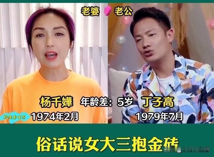 咱老话说“女大三,抱金砖”,这话搁娱乐圈里几对有名的姐弟恋身上,那真是应验得透透的。 先说杨千嬅和丁子高,俩人差5岁。杨千嬅是谁?那是唱《少女的祈祷》《可惜我是水瓶座》唱进人心坎里的港乐天后,是演《春娇与志明》里那个敢爱敢恨的余春娇。1979年出生的她,身上总带着股港女的飒爽和真性情。丁子高,1979年2月生,其实算同龄,但月份小,也就被归进“姐弟恋”了。 赵又廷和高圆圆,这可是娱乐圈里颜值顶配的一对。高圆圆,1979年出生,比1984年的赵又廷大5岁。多少人记忆里的高圆圆,是《倚天屠龙记》里清冷柔美的周芷若,是《咱们结婚吧》里温暖接地气的杨桃。她身上有种男女通吃的漂亮和舒服气质。赵又廷,凭《痞子英雄》出道,《三生三世十里桃花》的夜华让他大火,演技扎实,为人低调。他俩因戏结缘,2014年结婚,到现在十年了,女儿也生了。