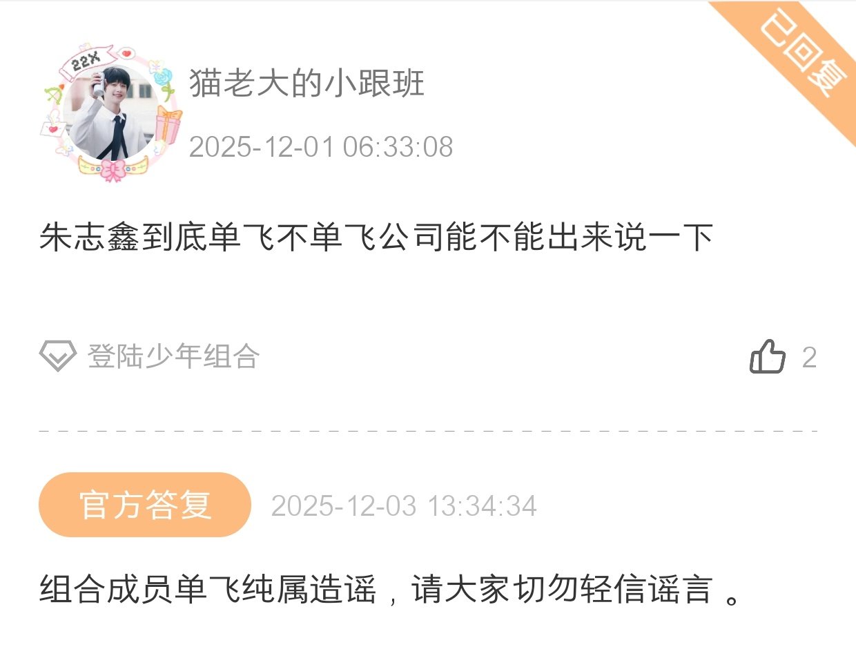 时代峰峻回应朱志鑫单飞问题 时代峰峻回应朱志鑫单飞问题:组合成员单飞纯属造谣,请大家切勿轻信谣言。咱就说李飞你对好点比啥都强
