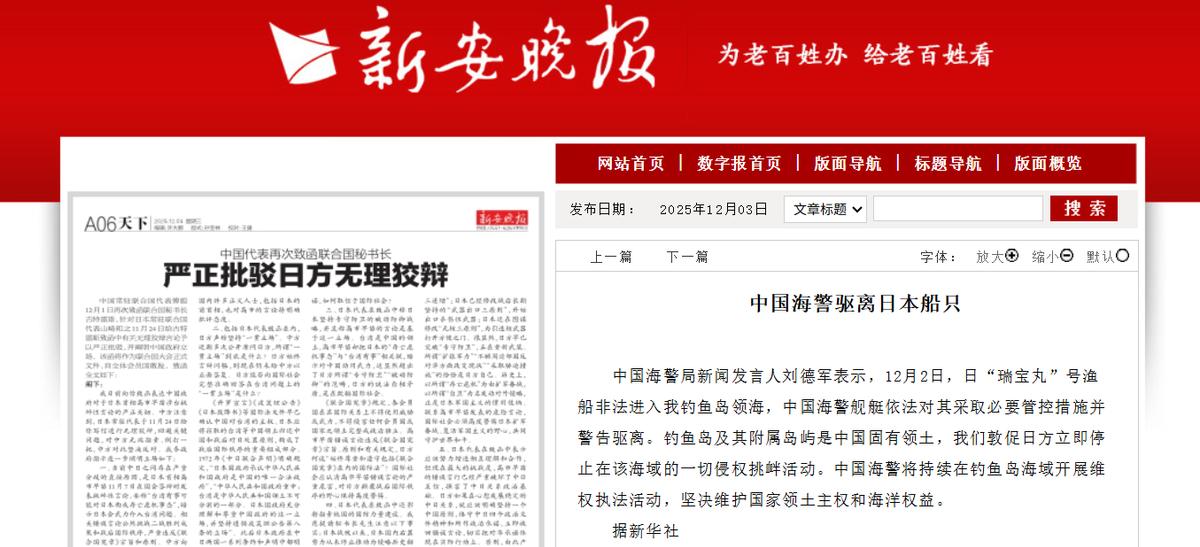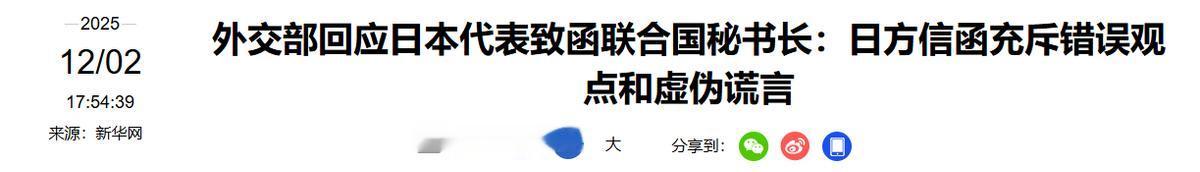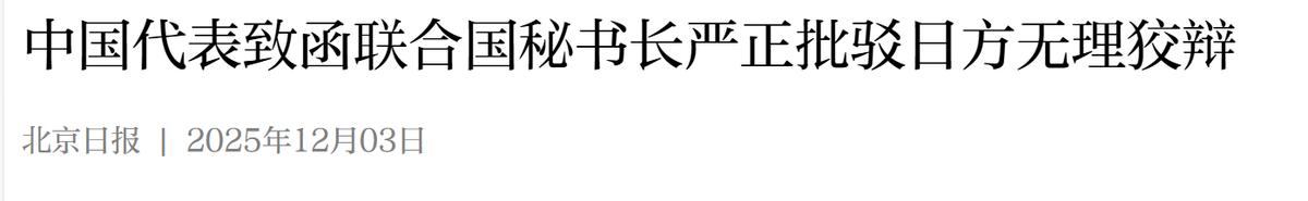 高市慌了!2025年12月3日报道,全球再度接到中国通知,中方发出第二封信函,并驱逐日本船只! 在最近一个月以来,中日两国关系因为日本现首相高市早苗错误的涉台言论急转恶化。在她说出错误性言论后,我国第一时间采取了实际行动,要求日本政府撤回其言论。但是日方却不知悔改,尤其是高市早苗更无意撤回其言论。 所以我国直接采取了实际的反制行动,在第一次致函联合国后,我国再度致函联合国秘书长。据媒体2025年12月3日报道,中国常驻联合国代表傅聪再次致函联合国秘书长古特雷斯。 在第二封信中明确指出,日方仍不知悔改,试图在进行狡辩。这封信是发向全世界,所以可想而知,迅速引起了极大的轰动。 傅聪大使之所以会第二次致函联合国秘书长,是因为就在前几日,日本方面针对我国第一封致函信进行了狡辩。 日本方面效仿我国的行为,但是在信中却一味的去进行狡辩,并且整封信充满了虚伪的谎言。日本的行为再度触及到了我国的底线,而我国也一直在等日本给出这个机会。 日本在采取这一行动之后,我国立即发出第二封信函。与此同时,在钓鱼岛附近更出现了激烈的对峙。 据了解,日本船只非法进入了我国钓鱼岛领海,我国海警在一经发现之后立即驱离了日本船只。日本的行为已经不再是简单干涉我国内政行为,而伴随着我国第二封信的发出,彻底坐实了日本的罪行。 就当下来说,事件发生到此,已经不是高市早苗简单道歉,就能掩盖过去的事情。对此,您怎么看? (信息来源:外交部回应日本代表致函联合国秘书长:日方信函充斥错误观点和虚伪谎言-新华网) (信息来源:中国代表致函联合国秘书长严正批驳日方无理狡辩-中国日报) (信息来源:中国海警驱离日本船只-新安晚报)