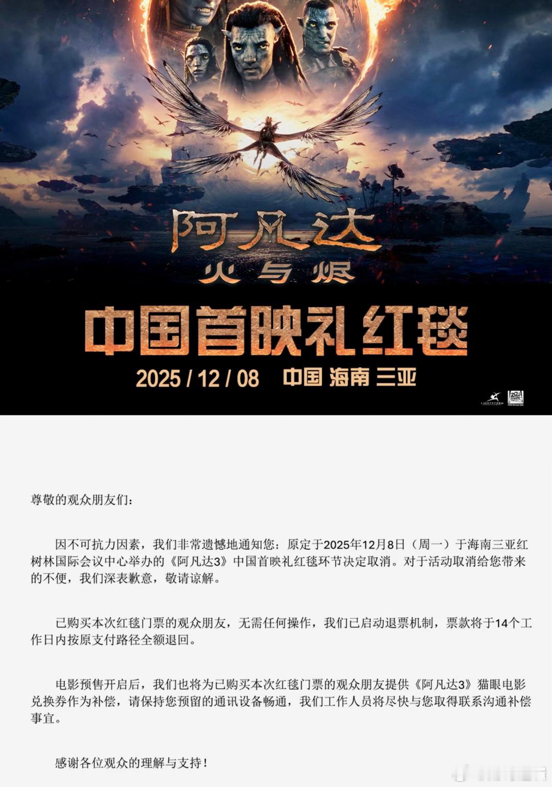 《阿凡达3:火与烬》取消中国红毯活动,因为首映礼环节有大火燃烧的互动装置,宣传片里也把副标题“火与烬”去掉了。应该是考虑到大埔火灾后做出的调整,照顾中国观众的情绪也算挺周到,也算是一种对灾情受难者的尊重,官方承诺退还门票费并补偿一张电影票。阿凡达3致歉