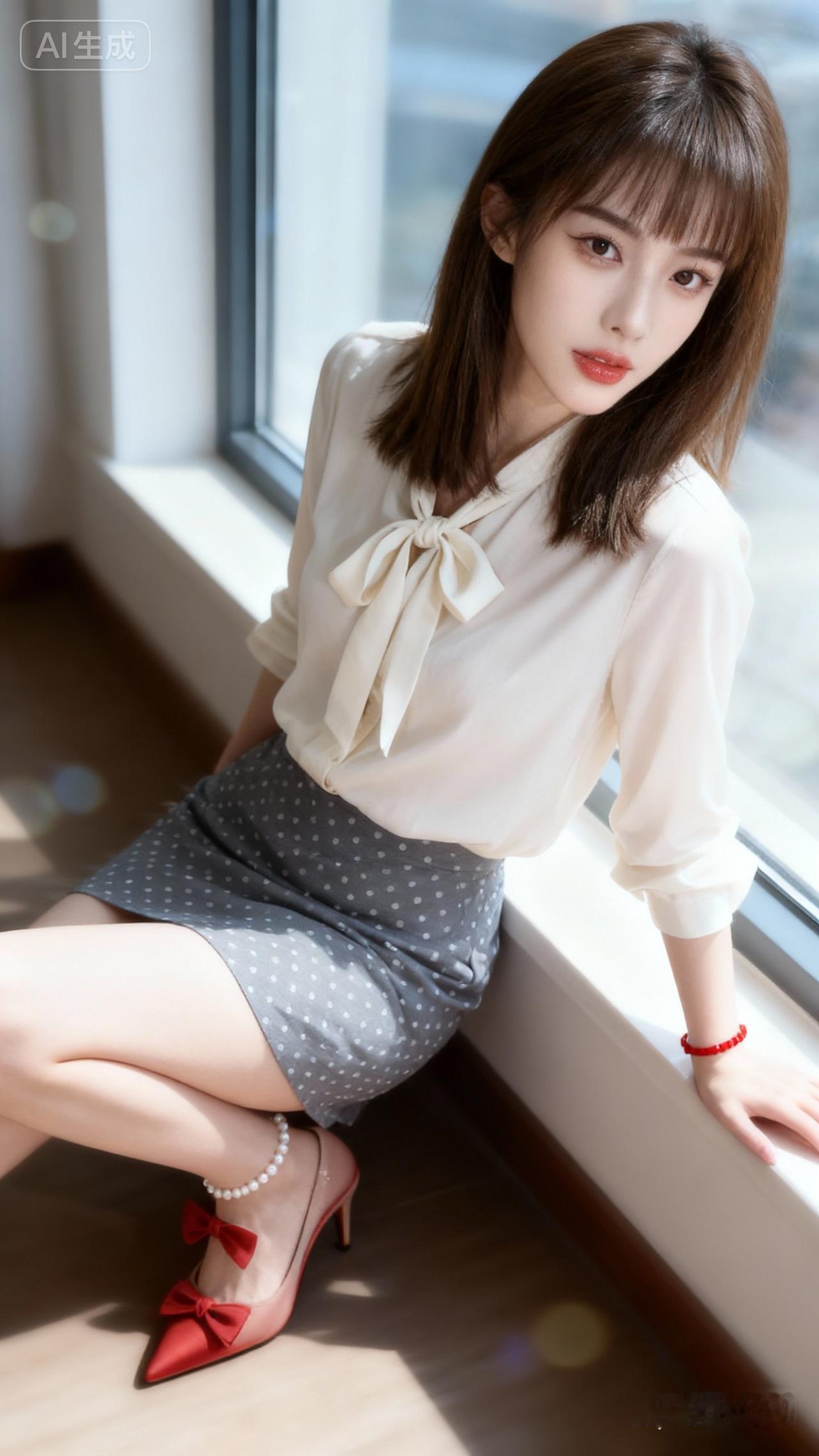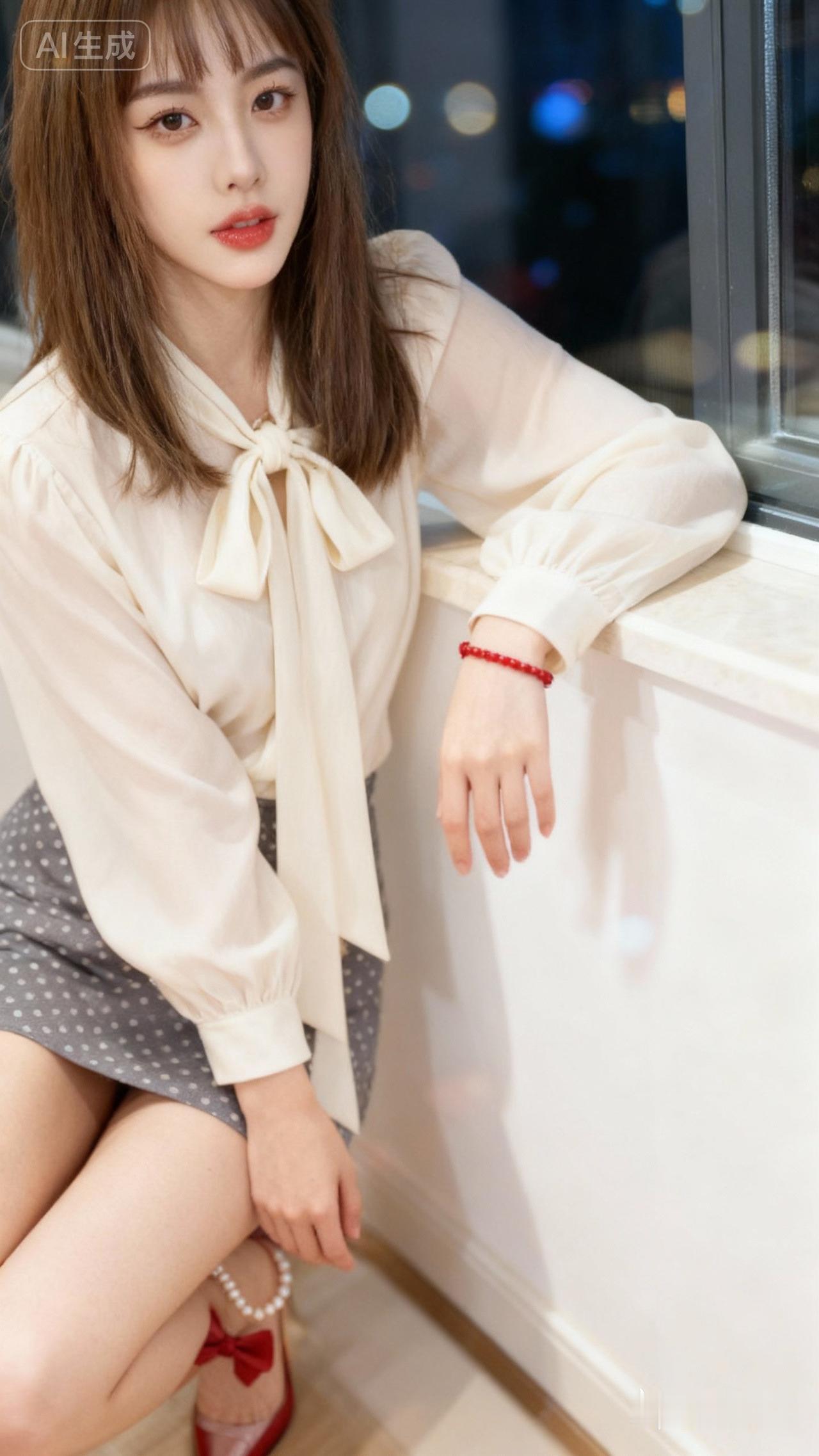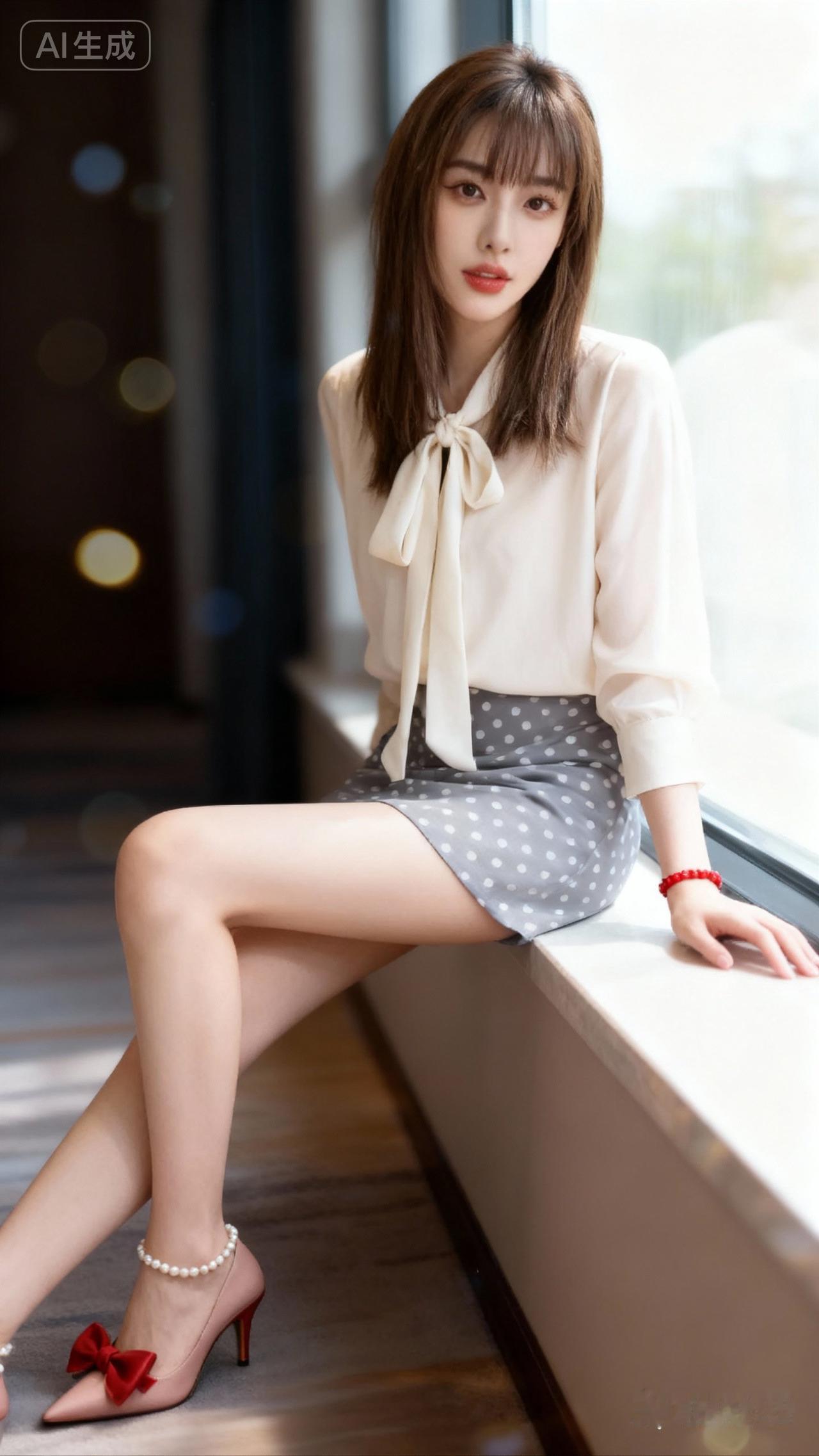 拥有苗条的身材是什么样的感觉一位有着棕色中长发、薄刘海、含情杏眼、水光肌的xhs纯欲风美女,身穿性感米白色系带蝴蝶结衬衫、胸围饱满挺拔,灰色波点短裙,脚穿浅红色蝴蝶结尖头高跟鞋搭配珍珠脚链,戴红色手链,依靠在窗台为什么我们都喜欢又白又高的美女