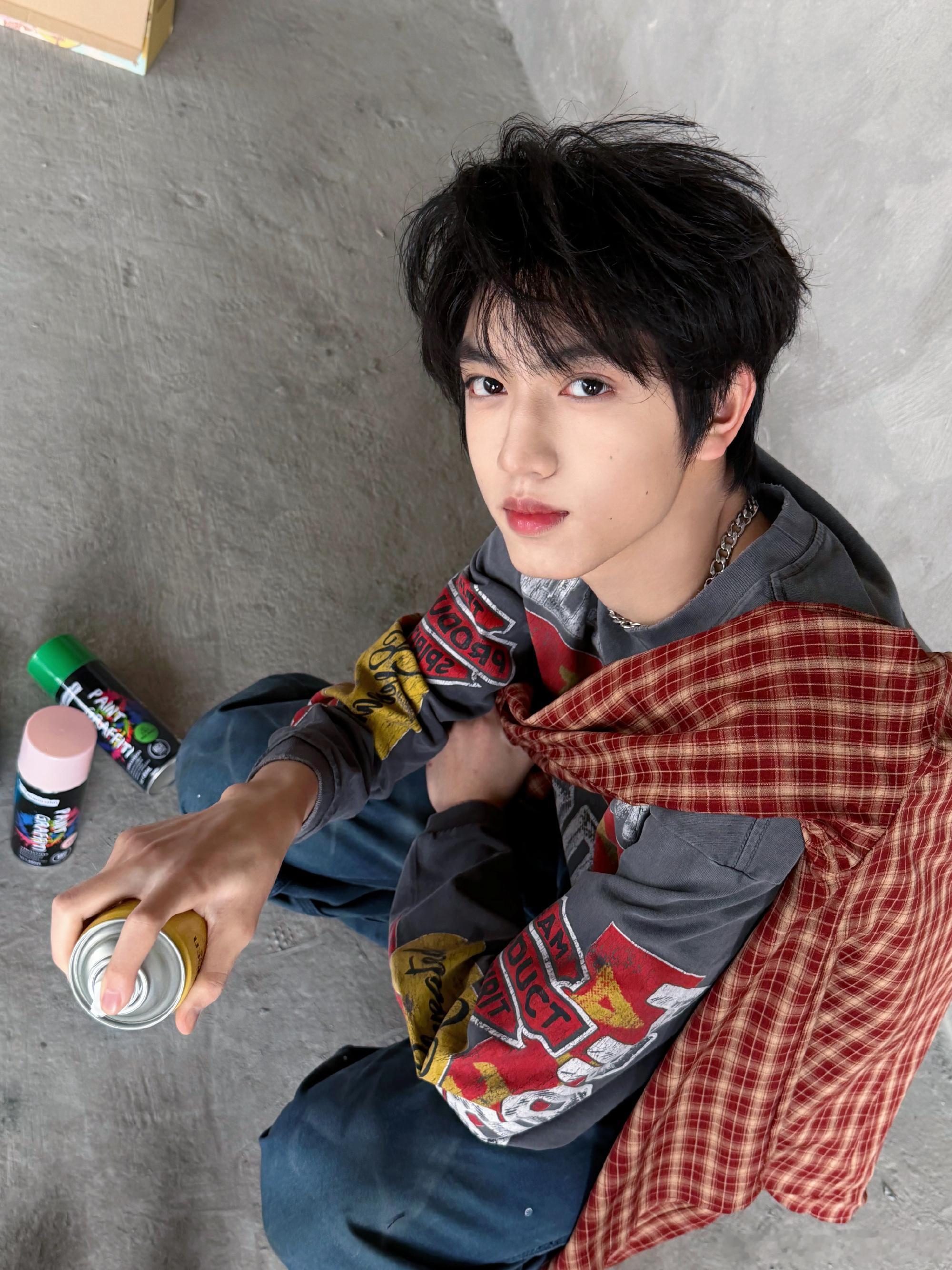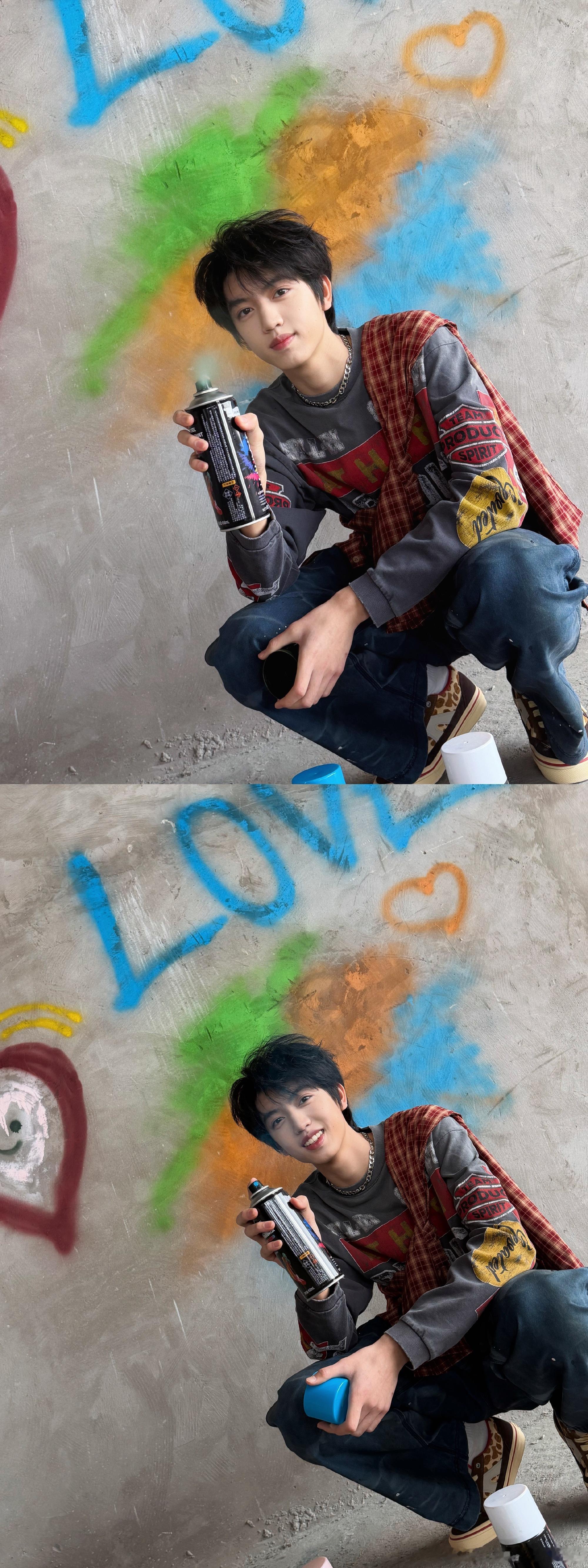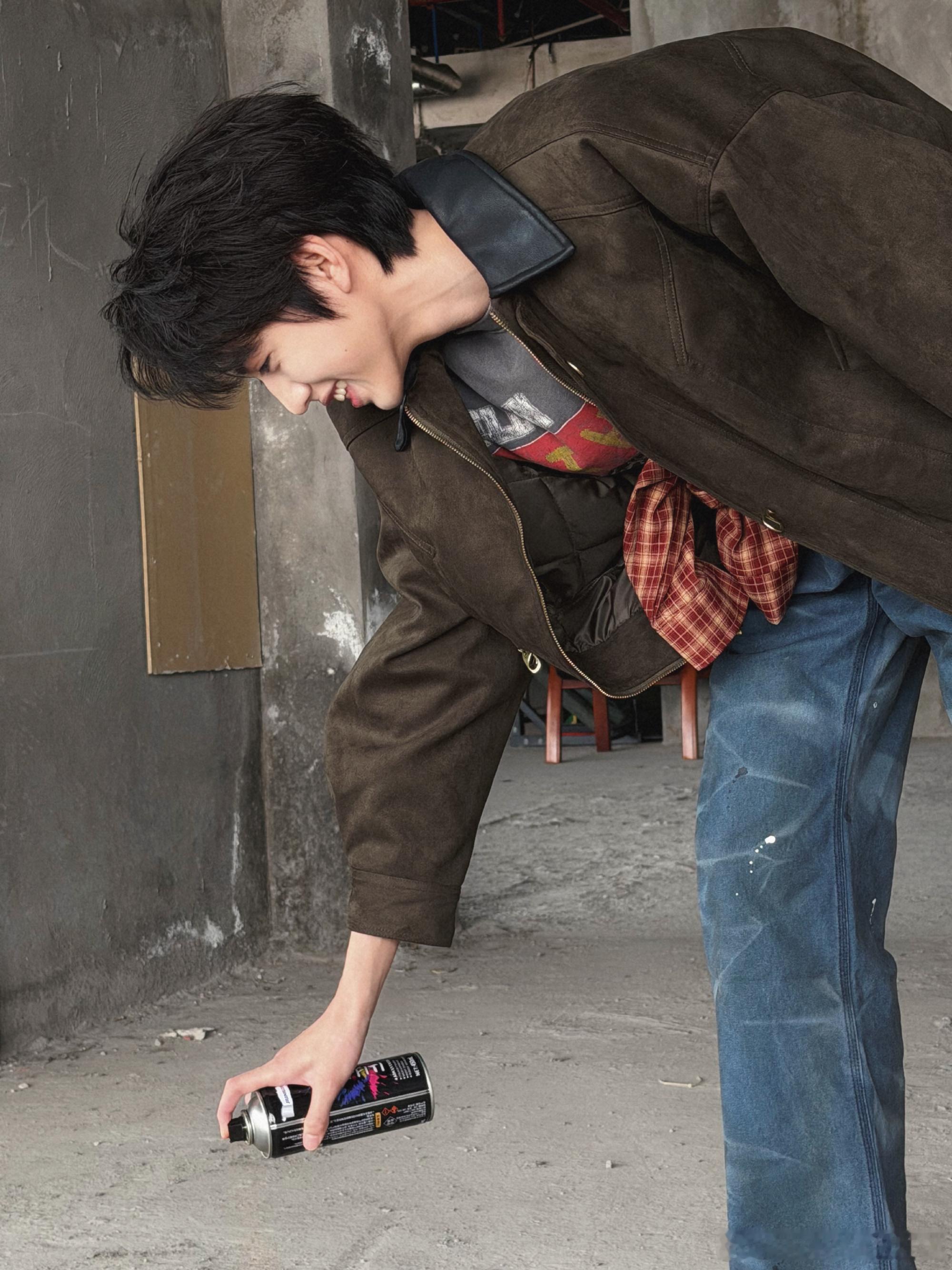 张桂源涂鸦照分享照片✏️红色内搭搭配牛仔裤和棕色麂皮皮衣复古感满满,涂鸦的桂源笑