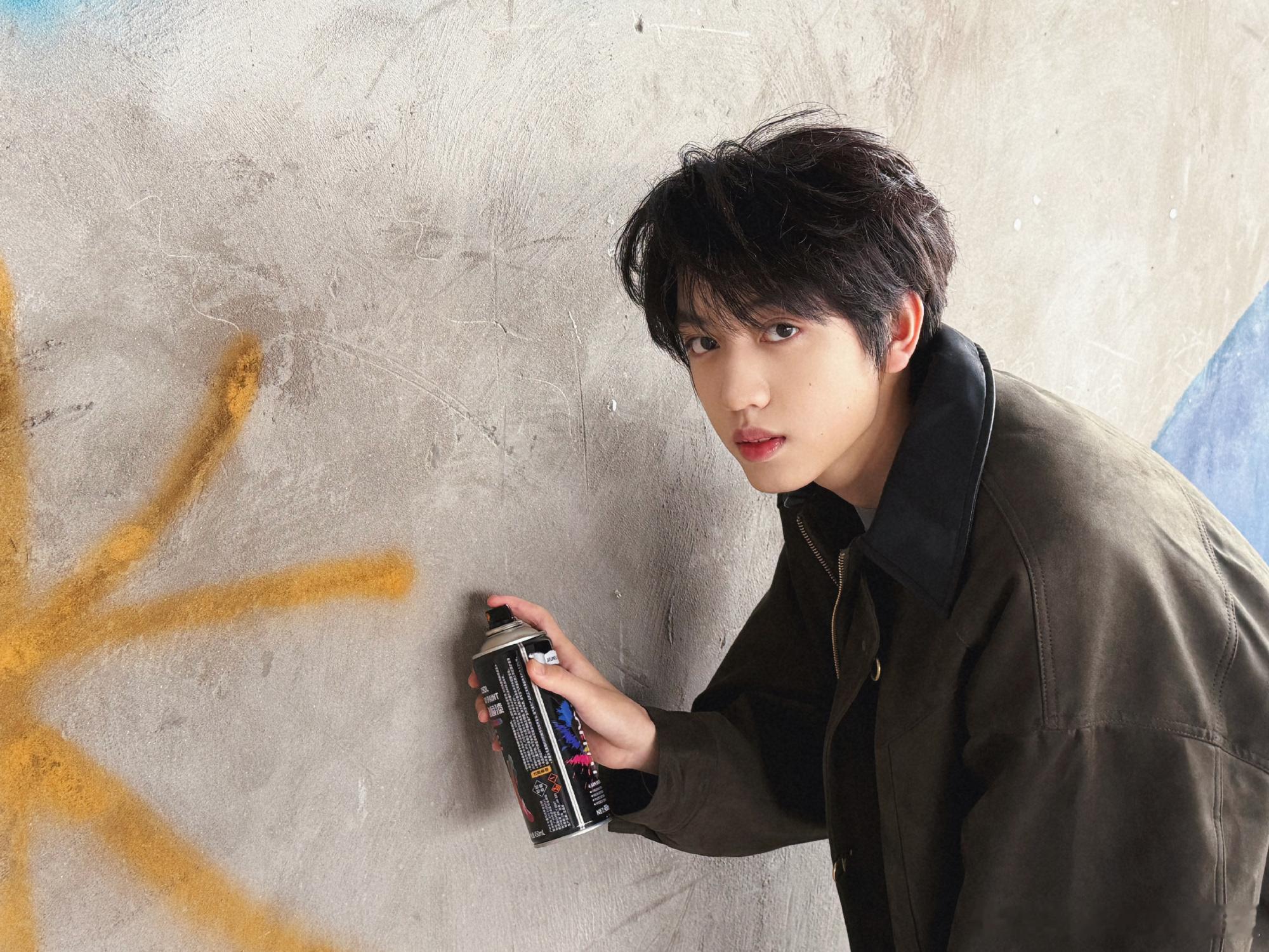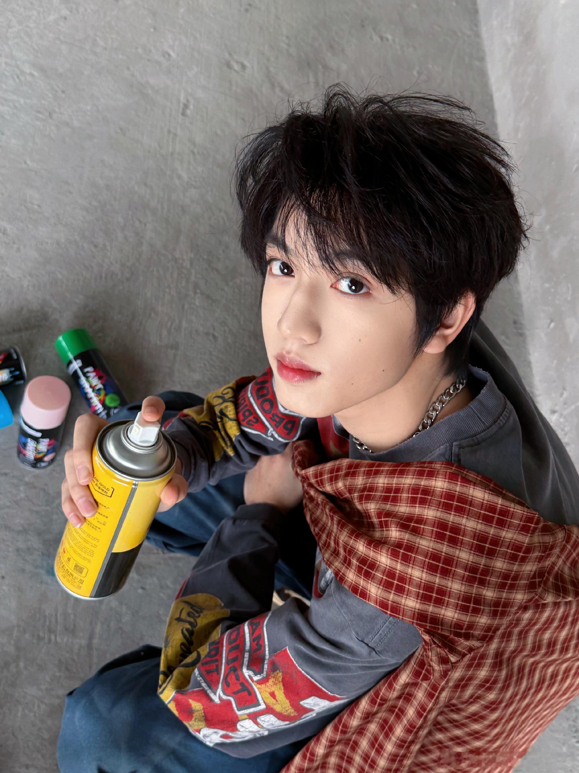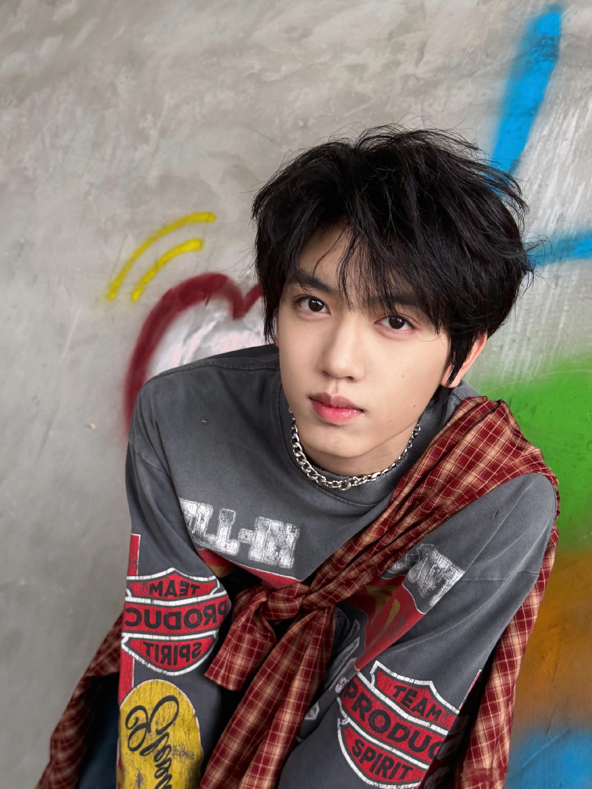 张桂源涂鸦照分享照片✏️红色内搭搭配牛仔裤和棕色麂皮皮衣复古感满满,涂鸦的桂源笑