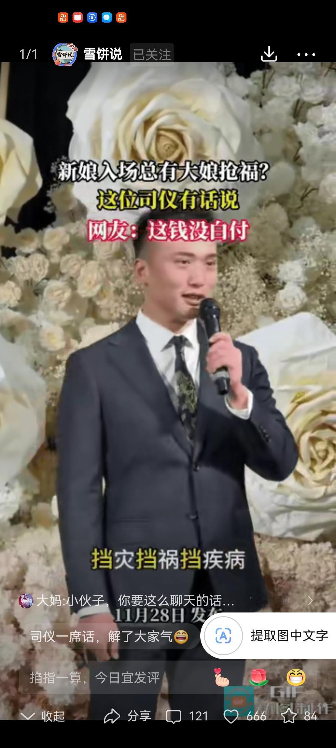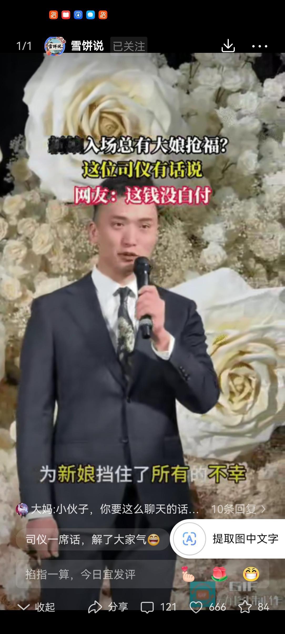 这下舒服了!一对新人结婚,在新娘准备入场时,一位大妈突然抢先跑了出来,来宾都明白什么意思,也都心里不快,可大妈却乐的嘴角都咧开了,不过接下来司仪的一席话,却让大妈笑不出来了。网友:这钱绝对没白花。 这位大妈突然从宾客席窜出来,抢在新娘之前站在红毯中央,脸上还挂着藏不住的得意,全场瞬间安静,不少人皱起眉头,心里都憋着一股气。 司仪先是顿了两秒,手里的话筒没停,笑着开口:“感谢大娘主动上前,这是给新人送福气来了!大娘门前过,挡灾挡祸挡疾病,为新娘挡住了所有的不幸,往后小两口日子顺风顺水、和和美美,咱们先给大娘鼓鼓掌!” 这话一落地,现场的尴尬瞬间化解,掌声顺着就响了起来。明眼人都知道大妈是来抢风头、讨彩头的,司仪没戳破,却悄悄给大家出了口气。 有网友刷到视频笑称:大妈本来想抢个好彩头,结果被司仪“捧”得下不来台,估计这会儿脸都僵了。 也有人说:婚礼是新人的主场,不是大妈耍小聪明的地方,只顾自己开心,不顾别人感受,真的很败好感。 其实做人做事都一样,分寸感很重要。婚礼上的祝福要真心,不是投机取巧的借口。你懂得尊重别人的场合,别人才会尊重你;凡事只顾自己,迟早会把路走窄。