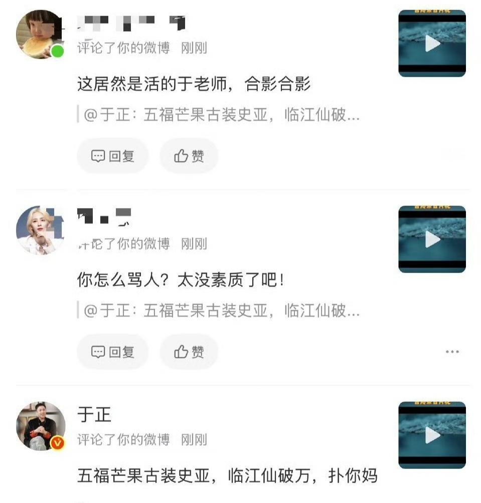 于正破防爆粗"扑你妈"!新剧数据掺水,公众人物底线呢? 娱乐圈这瓜吃得人直皱眉!于正被网友质疑新剧扑街,直接在评论区飙脏话"扑你妈",秒删后还拉黑用户,这操作让全网炸了,作品争议再添公众人物底线讨论。 2025年12月3号这天,于正的认证账号突然炸了锅。有网友吐槽《五福临门》《临江仙》市场表现不行,他直接回怼还带脏字,说"五福芒果古装史亚,临江仙破万",转头就删评拉黑,截图却被疯传。 可这数据根本经不住扒!《五福临门》集均播放量没进芒果年度前三,所谓"古装史亚"连权威认证都没有;《临江仙》号称"破万",实际口碑两极,离真正的爆款差着十万八千里。 网友们看得明明白白,有人说"数据好不好大家有眼睛,没必要爆粗吧",也有人吐槽"公众人物这么没风度,输不起还嘴脏",还有人翻出他之前的争议言论,说"这不是第一次失控了"。 作为圈内知名制作人,于正之前靠不少爆款剧圈了不少粉。可这次为了新剧数据,直接突破语言底线,用污言秽语回怼网友,实在太掉价,跟他的身份完全不搭边。 其实网友的质疑也不是没道理,现在影视圈拼数据,但也得实打实。《临江仙》被指热度算法掺了弹幕、氪金的水分,实际播放量远不如宣传的,口碑更是褒贬不一,吐槽声从没断过。 更有意思的是,他秒删言论的操作,越抹越黑。明眼人都能看出来是破防了,嘴上硬撑着说数据好,行动却暴露了心虚,这波操作不仅没挽回面子,反而让更多人质疑新剧的真实成绩。 公众人物的影响力可不是闹着玩的,一言一行都被盯着。就算网友的评价有争议,也该理性回应,用脏话回怼、拉黑用户,既解决不了问题,还会败坏路人缘,得不偿失。 之前于正就因为各种争议言论上过热搜,这次更是突破底线。作为制作人,与其纠结网友的差评,不如把心思放在打磨剧本、提升作品质量上,作品好了,自然没人质疑。 现在影视圈确实卷,数据压力大可以理解,但不能为了维护虚假数据就失控。观众看剧看的是内容,不是虚高的热度和互怼的戏码,踏踏实实做作品才是长久之计。 网友们的眼睛是雪亮的,数据掺没掺水、作品好不好看,心里都有数。靠爆粗和删评捂不住悠悠之口,反而会让大家更反感,最后只会反噬自己的口碑和事业。 作为公众人物,该有基本的风度和底线。接受批评、正视问题,才是成熟的表现。要是连不同声音都听不进去,动辄爆粗口,迟早会被市场和观众抛弃。 作品硬才腰杆硬,风度才是真底气!公众人物的口碑靠作品攒,不是靠爆粗怼出来的。正视争议、打磨内容,才能走得长远,耍脾气、爆脏话只会自毁前程!