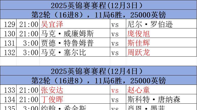12月3日21:00,吴宜泽vs尼尔-罗伯逊,实力数据分析! 2025斯诺克英锦赛1/8决赛! 年龄:22-43; 职业球龄:4-27; 巡回赛冠军数量:1-26; 单杆147数量:0-5; 世界排名:13-3; 两人历史交锋4次,1胜3负。最近一次交锋:2024斯诺克英国公开赛决赛,尼尔-罗伯逊9-7击败吴宜泽。 #英锦赛##2025斯诺克英锦赛##吴宜泽##尼尔罗伯逊#