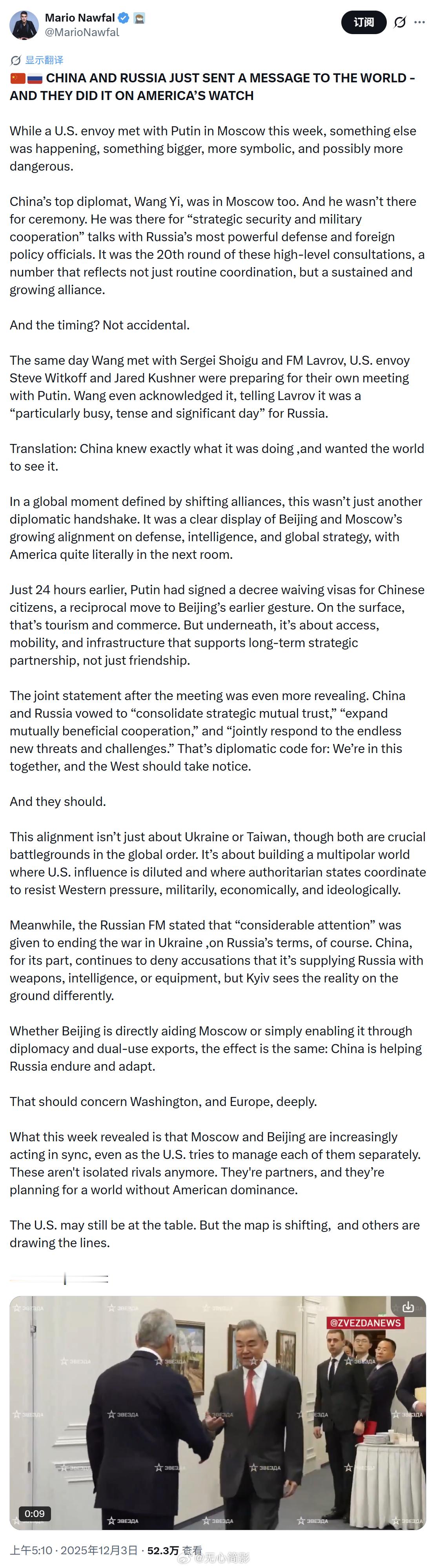 中俄就涉日本问题进行战略对表 看看这篇评论:中国和俄罗斯刚刚向全世界发出了一条信息——而且是在美国的眼皮底下完成的!中国最高外交官王毅也在莫斯科。而且他不是来闲聊的。他是来与俄罗斯最有权势的国防和外交政策官员进行“战略安全磋商”的。这是第20轮这样的高层磋商,这个数字本身就说明这不是例行协调,而是持续深化、不断升级的联盟。时机?绝非巧合。就在王毅与俄罗斯外长拉夫罗夫、俄联邦安全会议秘书绍伊古会晤的同一天,美国特使Steve Witkoff和Jared Kushner正在为他们自己与普京的会面做准备。王毅甚至当着拉夫罗夫的面承认那天对俄罗斯来说是“特别忙碌、紧张且意义重大的一天”。翻译过来就是:中国非常清楚自己在干什么,而且就是要让全世界看见。在联盟不断重组的全球关键时刻,这不是一次普通的外交握手。这是在北京和莫斯科之间,围绕国防、情报和全球战略的公开而清晰的结盟展示——而美国人就坐在隔壁房间里。就在24小时前,普京刚刚签署法令,宣布对中国公民免签。这表面上是旅游和商务便利,但实际上是为长期战略伙伴关系铺平人员、基础设施和后勤通道。会后联合声明更是毫不掩饰:中俄承诺“巩固战略互信”“扩大互利合作”“共同应对无休止的新威胁和新挑战”。外交辞令翻译成白话就是:我们是一条船上的,西方面临的压力我们一起扛。西方应该警觉了。这种结盟不仅仅关乎乌克兰或台湾,尽管这两者都是全球秩序的关键战场。它是要构建一个多极世界,在这个世界里美国的影响力被稀释,威权国家联合起来,在军事、经济和意识形态上共同对抗西方的压力。与此同时,俄罗斯外长表示,在结束乌克兰战争的问题上,“相当大的注意力”被给予了中国的立场。当然,中国继续公开否认向俄罗斯提供武器、情报或装备,但基辅在战场上看到的现实显然不同。无论北京是直接援助莫斯科,还是仅仅通过外交和两用物资出口为其提供支持,结果都一样:中国正在帮助俄罗斯挺住、拖延、适应。这应该让华盛顿和欧洲深感担忧。本周揭示的最重要信息是:莫斯科和北京的行动越来越同步,即便美国试图分别与它们打交道。它们不再是孤立的对手。它们是伙伴,而且正在为一个没有美国主导的世界做规划。美国可能还坐在谈判桌前。但地图正在被重新绘制,其他人在画新界线。海外新鲜事