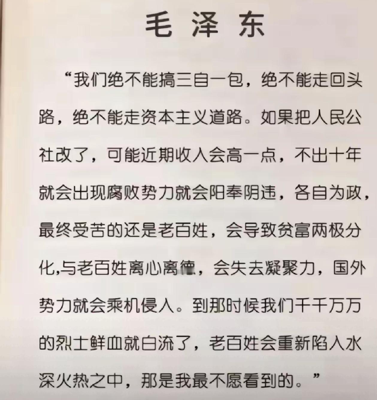 毛主席真的太伟大,他老人家当时早就已经想到了中国现在遇到的情况, 而且也早就给我们指明了方向,留下的招数,这些都在他留在世上的语录和著作中,他老人家很早就一针见血看到了当时苏联的弊端以及潜在的危险,而后面苏联解体的事实也证实了毛主席的眼光和智慧,面对现在和未来的局面,我们更应该多学学他老人家留给我们的东西!