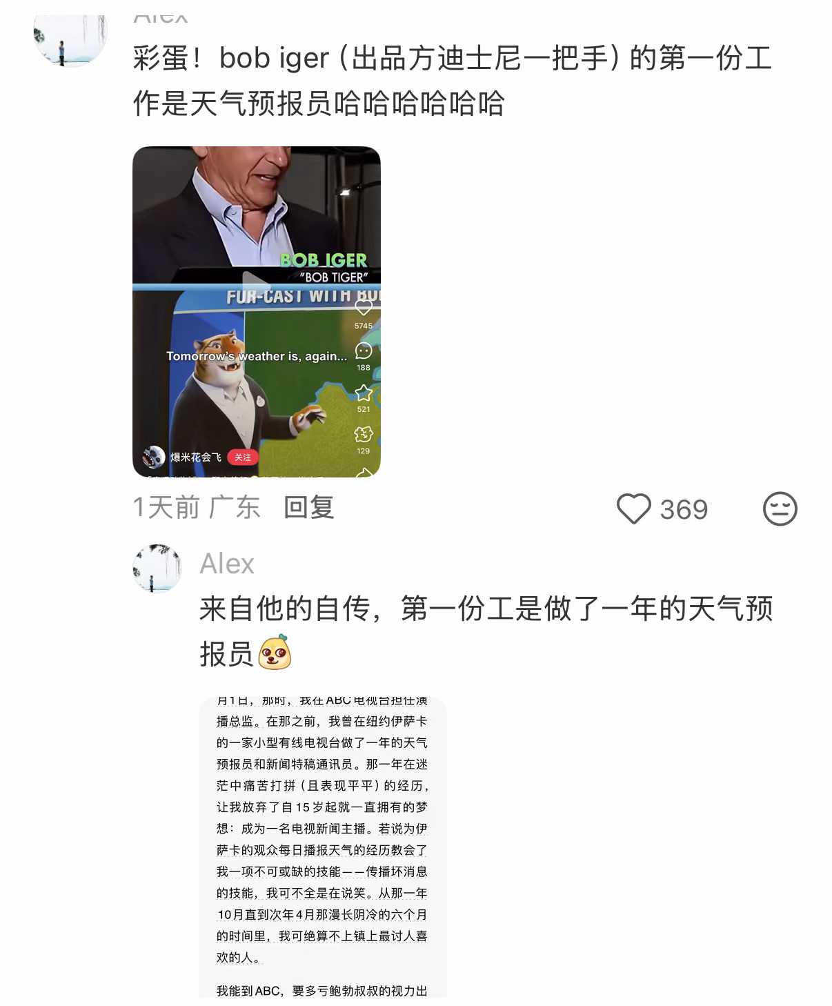 彩蛋之一:迪士尼CEO参与了《疯狂动物城2》配音。片中的天气预报员老虎Bob Tiger由迪士尼CEO鲍勃·艾格配音,他的第一份工也是天气预报员。疯狂动物城疯狂动物城彩蛋