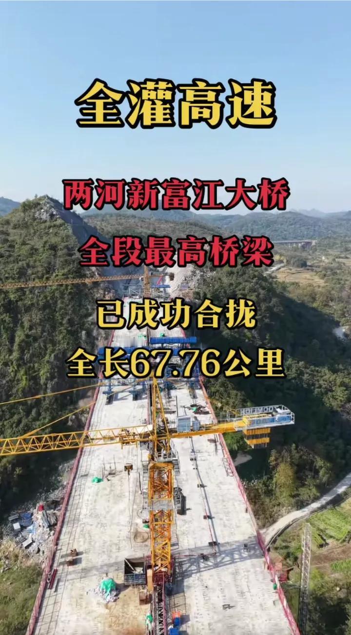 正在建设,桂林全州庙头(湘桂界)至灌阳新圩的全灌高速正在全速建设中,未来直连永州东安,预计2026年内可以全线建成通车,届时永州和衡阳等地开车来往灌阳和恭城还有玉林等地将更加便捷,目前两河新富大桥已经顺利合龙(图三图四),全长约1.1公里的湘江特大桥正在加速建设中,部分路面已经开始铺设水稳层,全灌高速全长约68公里,起于全州庙头黄土井接待建的东全高速,止于灌阳铺门前与G76厦蓉高速互联互通,双向四车道,设计时速120公里每小时(以实际为准),期待全线建成通车方便周边区县和沿途乡镇来往与文化交流。