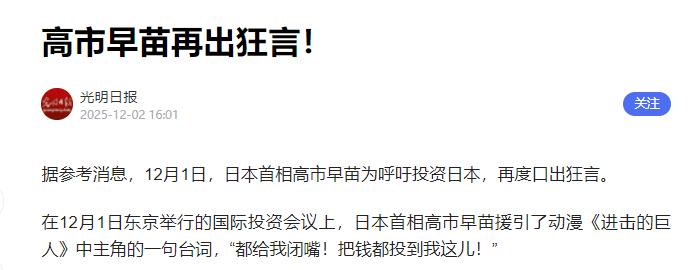 高市早苗又翻车了!当地时间12月1日,日本首相高市早苗为呼吁大家投资日本,竟然口出狂言:都给我闭嘴!把钱都投到我这儿!   12月1日东京那场沙特投资大会上,日本首相高市早苗算是把“丢人”俩字焊在脸上了。   当着沙特金主、自家财政大臣的面,她扯着嗓子喊出一句改自《进击的巨人》的台词:“都给我闭嘴!把所有钱都投到我这儿”。   好好的国际招商会,硬是被她搞成了全网群嘲的“二次元闹剧”。   谁都知道这会是日本的“救命钱大会”。今年是日沙建交70周年,日本把半导体、AI这些17个急需输血的领域全摆上台面,就盼着沙特主权基金这个全球顶级“钱包”能松松手。   可沙特人投资从来只认三个理:地方稳不稳、产业对不对路、能不能赚钱,哪吃“动漫耍帅”这一套?别说国际场合,就是街坊邻居借钱,你敢说“闭嘴给钱”,保准得被骂出门。   她敢这么横,根本不是玩梗玩上头,是日本经济真的快扛不住了。现在日本的债务已经飙到GDP的263%,比战时还高,相当于一年挣10块钱,欠着26块的债。   三季度GDP又跌了1.8%,超市里的咖啡涨了快六成,大米价格都翻倍了,老百姓连买菜都得掂量,政府却忙着把钱砸进防卫预算,提前要把防卫费提到GDP的2%。   之前就因为她喊“台湾有事即日本危机”,中、韩、俄、朝四国一起骂她,中日关系一降温,日本旅游退订潮、出口下滑全来了,半导体这些关键行业没人投钱,只能靠拉外资救命。   急归急,但用错招比没招更要命。《进击的巨人》这动漫本身就有军国主义争议,她自己又是出了名的右翼强硬派,这不等于把“真实想法”挂脸上吗?   更晦气的是,原作里说这话的角色,下一幕就被揍惨了,日本网友都调侃“这是咒日本呢”。   安倍当年招商喊“Buy my Abenomics”,虽然直接但透着务实;她倒好,人家台积电来日本建厂,政府实打实给了4760亿日元补贴,她却光靠耍嘴皮子,简直是自欺欺人。   市场最诚实,她喊完这话当天,日经指数就暴跌近1000点,创下近期最大跌幅。更打脸的是,沙特那边至今没半点表态。   说到底,高市早苗的闹剧就是用政治表演掩盖执政无能。日本现在明明是求着别人给钱,却还端着傲慢的架子,这种“站着要饭”的心态,只会让全球资本躲得更远。   她的一句狂言,不光丢了日本的脸,更戳破了日本经济外强中干的真相,靠这种荒诞的政客和空洞的表演,根本救不了日本,只会让它在错误的路上越走越远。