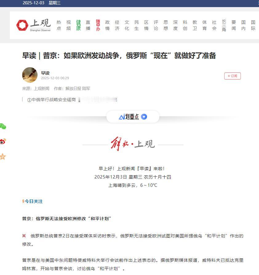 俄罗斯已做好三战准备! 俄罗斯总统普京在12月2日接受媒体采访时明确表态,不认同欧洲对美国提出的俄乌“和平计划”进行修改的做法。 他点明,欧洲修改这份计划的目的就是阻碍和平进程,还想把和平进程失败的黑锅扣在俄罗斯头上。 普京还着重强调,俄罗斯从来没有主动与欧洲开战的想法,但如果欧洲率先挑起战争,俄罗斯目前已经做好了充分的应对准备。 这话不是随口的场面话,也不是被逼急的无奈回应,而是有实打实的实力支撑,也摸透了欧洲的心思,透着十足底气,谁小看这份决心,早晚要吃亏。 这事的起因很简单,欧洲非要修改美国的俄乌“和平计划”。明眼人都明白,这根本不是推进和平,而是故意搅黄谈判。 美国那份28点计划刚出台,欧洲就跳出来反对,还拉着乌克兰在日内瓦开会大改,张口就要求乌克兰恢复1991年边界,这条件俄罗斯肯定不能接受。 说白了,欧洲就是不想让战争停,想借改计划把谈判破裂的锅推给俄罗斯,继续靠援助乌克兰消耗俄罗斯。 普京早看穿这小把戏,直接戳破并放狠话:若真想把冲突升级为和欧洲的直接战争,俄罗斯奉陪到底。 有人可能会问,俄罗斯真准备好了吗?先看军事,今年9月俄罗斯和白俄罗斯刚完成“西方-2025”联合军演,就是最直接的证明。 演习9月12日至16日举行,覆盖两国多个训练场及波罗的海、巴伦支海海域,规模不小。 演习绝非摆样子,米格-31战机携高超音速导弹在巴伦支海巡逻四小时,苏-57隐形战机掩护苏-34精准打击,北方舰队还试射了拦不住的“锆石”高超音速导弹。 空降兵演练了长途飞行空降敌后,连非战略核武器使用都规划演练了,普京还亲自观摩演习收尾,明摆着军事准备绝非纸上谈兵,随时能实战。 除了演习,俄罗斯军事部署也紧跟其后。普京表态当天,俄国防部披露,俄军在顿涅茨克、哈尔科夫一带持续推进,一周内占领8个定居点。 战略火箭部队试射了第五代“萨尔马特”洲际导弹,黑海舰队新护卫舰携“锆石”导弹部署地中海,形成直接战略威慑。 再看欧洲,嘴上强硬,动作也露野心,德国拟调80万北约军人至俄边境,北约官员甚至放话考虑对俄先发制人。 面对这般威胁,俄罗斯早有准备,如今俄军既有实战经验又有先进装备,根本不惧欧洲来硬的。 打仗终究拼经济,美西方制裁用尽手段,俄罗斯却没垮反更稳,这就是经济底气。 2024年俄罗斯GDP增长4%,失业率降至2.3%的历史低位,优于不少欧洲国家。西方曾想靠能源制裁卡脖子,俄罗斯推出卢布结算机制,瞬间稳住汇率。 如今俄罗斯贸易已不依赖欧洲,与印度能源贸易额从2021年不足100亿美元增至2023年450亿美元,2024年前11个月印度日均从俄进口176.4万桶原油,占其进口总量36%;与中国贸易95%用本币结算,彻底摆脱美元、欧元束缚。 其实普京一直给欧洲留余地,反复表明不想与欧洲开战,可欧洲不领情,执意跟着美国一条道走到黑。 如今欧洲内部早已分裂,一边是主张削弱俄罗斯的强硬派,一边是担忧经济崩溃、怕引火烧身的务实派,但强硬派声音盖过理性。 普京此时放狠话,就是要敲醒欧洲糊涂政客:别小瞧俄罗斯,别误判其维护安全的决心。俄罗斯军事有准备、经济扛得住,欧洲若敢开战,必付惨痛代价。 说到底,普京的表态不是挑事,而是以强硬态度阻止战争扩大。和平从不是妥协换来的,需靠实力对等的威慑。 欧洲若真为民众着想,就该停下阻挠和平的小动作,坐下来好好谈判,别侥幸试探俄罗斯底线。 俄罗斯已把话摆明:“现在”就做好准备,这是给欧洲划的红线,谁越线谁担后果,绝非空话。