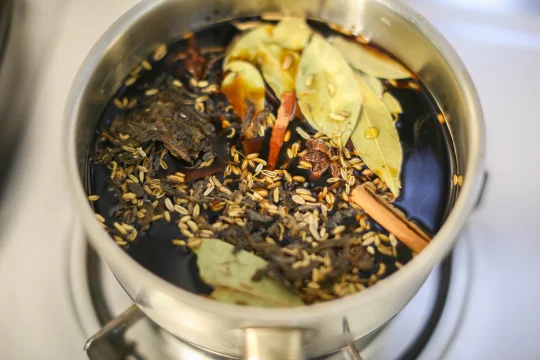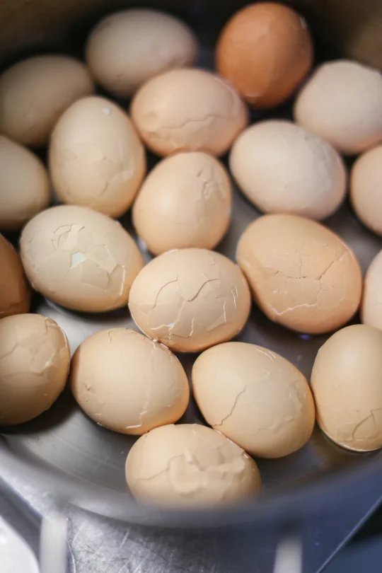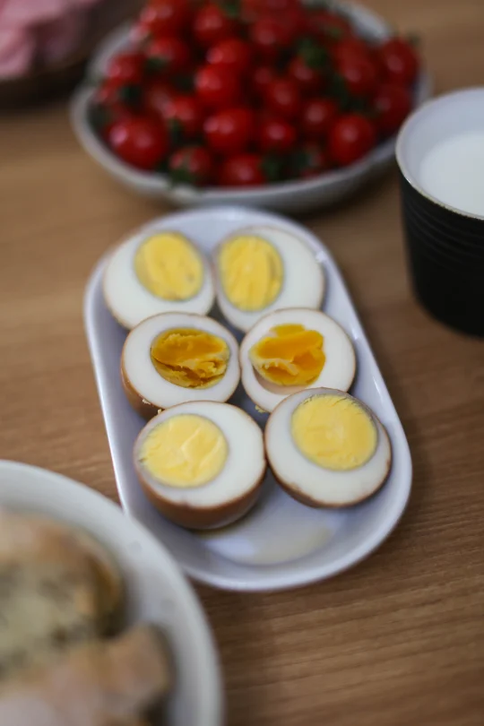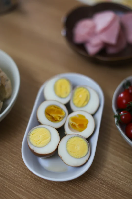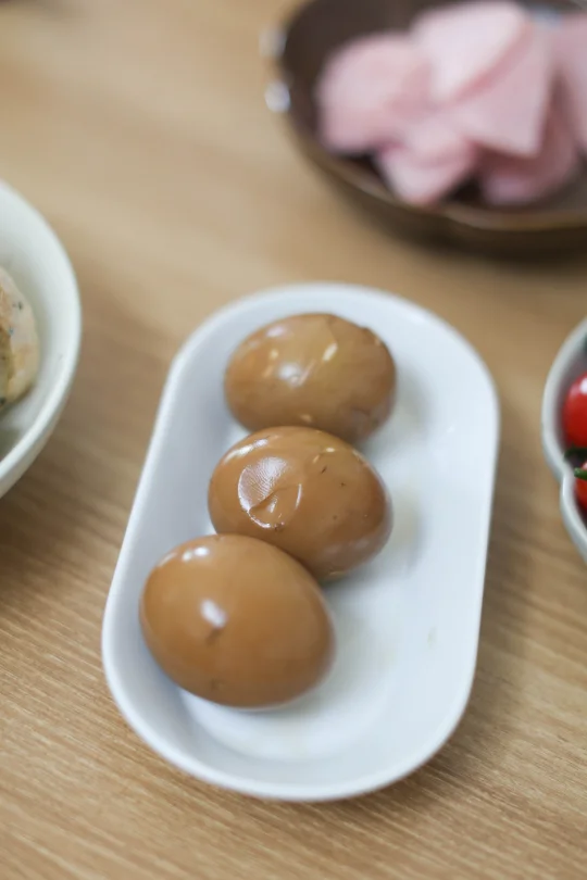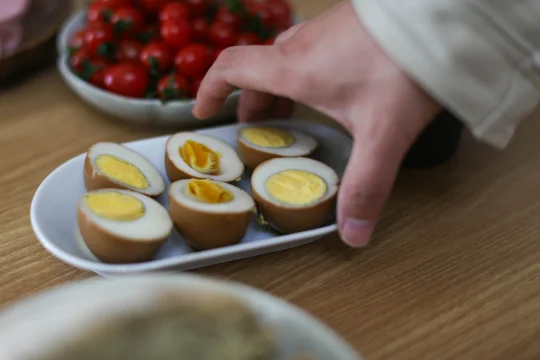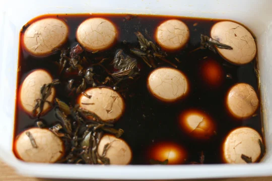 鸡蛋 10个 八角 2个 香叶 2克 桂皮 1克 小茴香 2克 糖 30克 盐 20克 老抽 15克 生抽 25克 水 600克 红茶茶叶 5克 1:把鸡蛋清洗干净,放在冷水锅里,大火煮开,关火焖5分钟即可。 2:把调味料放在一起,清水倒入。 3:香料清洗干净,放在容器中。 4:这里的茶叶必须要用红茶茶叶,普洱类也可以,绿茶、花茶之类的味道没有红茶好。 5:将调料和香料倒入锅里,先大火煮开,小火烧个3分钟,加入茶叶,让香料和茶叶的味道融合。 6:将之前煮好的鸡蛋表面敲到裂纹,表面敲的均匀一点,不然不容易入味,继续大火烧开,小火煮5分钟。 7:时间到了之后,关火,继续冰箱冷藏泡12-20个小时再吃效果更好。 如果想吃溏心蛋,最后一次煮的时候时间可以缩短为2分钟