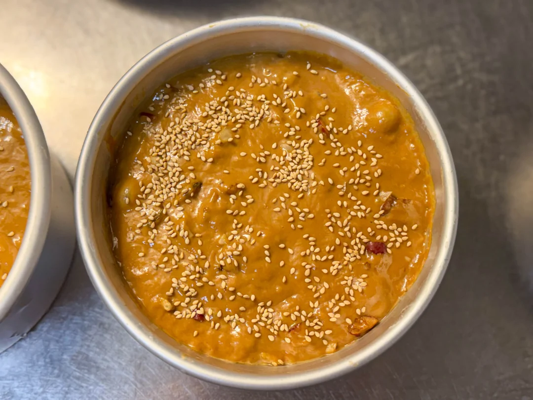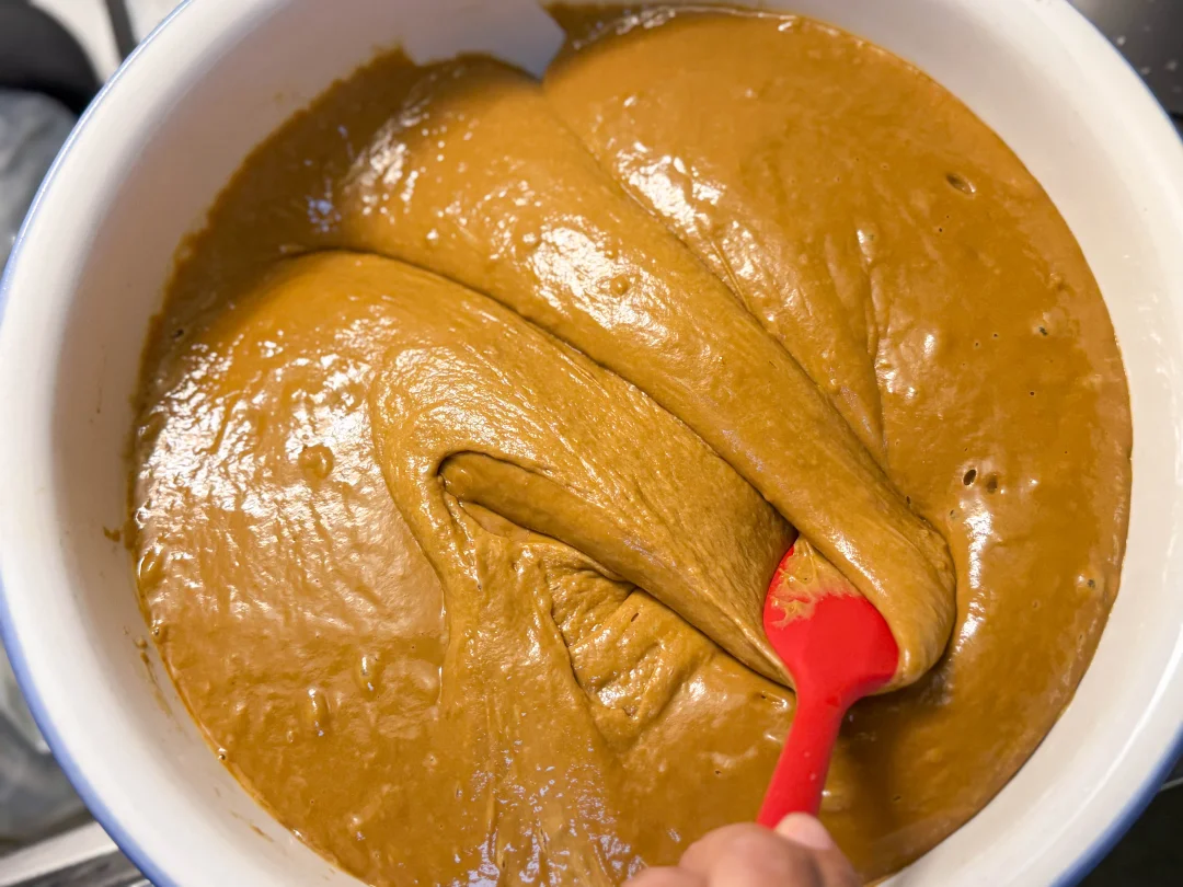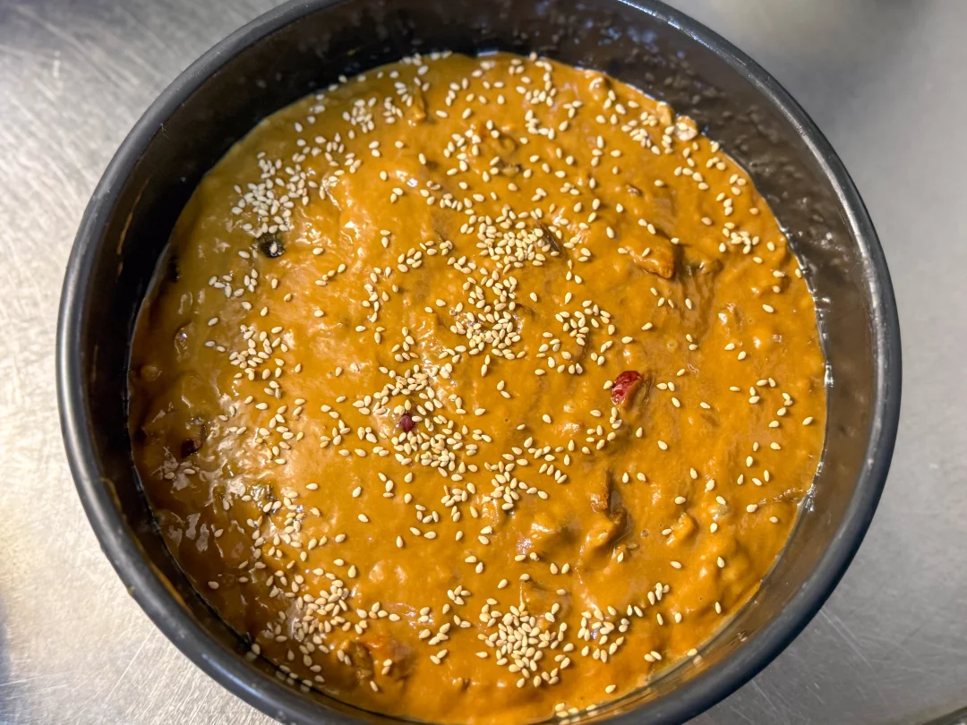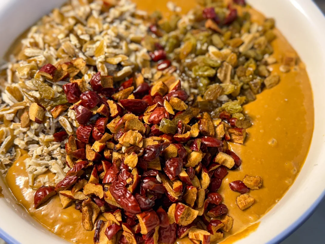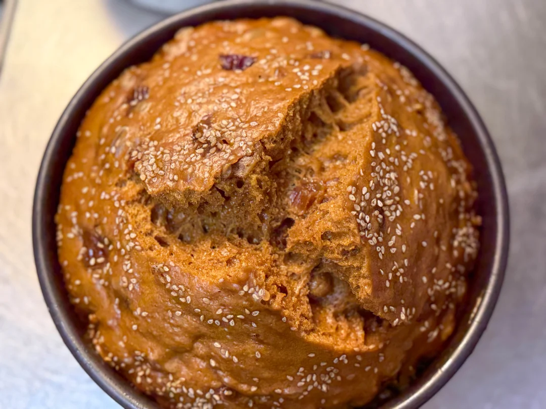 方便省事又省时,早上即使起的晚,拿上一块出门,带在路上当早餐,也非常方便。 对于女生来说,长期坚持吃,红润又好看,养颜。 一次可以多做点,分份冷冻起来,提前解冻,微波炉加热或者蒸下都可以。 中筋面粉:1200克 (2个6寸/1个8寸或者4个6寸) 酵母:12克 牛奶:340克 开水:400克 红糖:320 鸡蛋:8个 去核红枣:140克 葡萄干:80克 核桃仁:80克 玉米油:30克 步骤: 1:把红糖放入开水中,搅拌融化,温度降到30度左右加入牛奶,搅拌均匀,加入蛋液。 2:加入酵母,搅拌至酵母融化,酵母水制作完成。 3:加入中筋面粉,顺着一个方向不断搅拌,直至呈现厚厚的酸奶状态即可。 4:盖上保鲜膜,放在室温大约26度左右的地方,发酵一个小时。 5:时间到了之后,内部有很丰富的气孔状。 6:去核红枣切成碎颗粒、加入葡萄干、核桃仁颗粒或者其它自己喜欢的果干和坚果。 7:放入发酵好的红糖面团中,加入玉米油,搅拌均匀。 8:容器中抹上适量玉米油,将搅拌好的红糖面糊倒入容器中,撒上适量白芝麻。 9:放在室温大约26度左右的地方,继续发酵大约20分钟,略微膨胀即可。 10:开水上锅,上汽之后蒸大约50-60分钟。 11:晾凉之后,切成等份量,密封冷冻起来即可。 把繁琐的生活简单过,简单的美食也可以做得非常好吃又好看,女生们,大家快做起来吧~