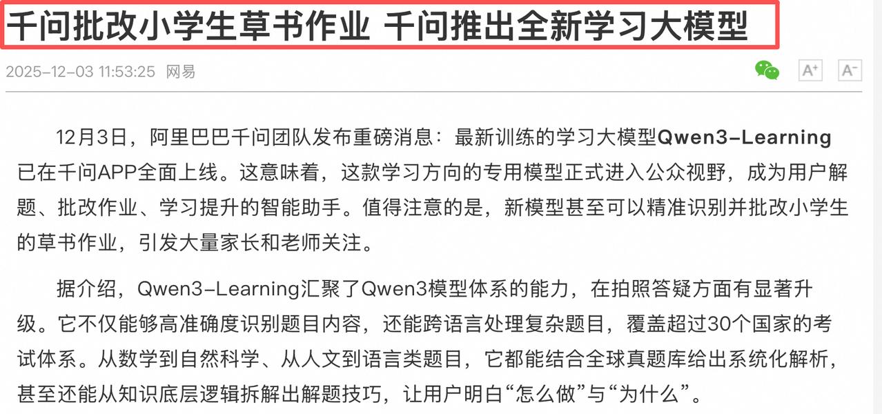 驻华大使都点头认可的东西,那还说啥了,只要是能帮到孩子教育的事情,我举双手赞成。 这两天教育圈最亮眼的消息,不是哪个培训机构又跑路,也不是哪个教育改革引发争议,而是一位驻华大使,因为他公开安利了中国的“AI老师”。 12月3日,阿里千问把拍照答疑和作业批改两大能力一次性升级,多米尼克驻华大使马丁·查尔斯在体验后也是大为认可。 他在采访里反复强调一句话:“这不仅是中国孩子们的福音,也是全世界孩子们的福音。” 这句话,乍一听可能觉得是人情世故,但仔细一琢磨,我觉得确实不一般。 首先,中国AI被全球外交官点名表扬,这是教育技术影响力真正突破国界的信号。坦白说,过去的AI 产品,更多是会答,但未必会教,而千问是中国教育土壤里长出来的“会教学的 AI”,这就是突破。 千问的讲解不是机械地照搬标准答案,而是按照老师的思路,把知识点、考点、易错点一层层拆开,真正让孩子把知识点吃透。一份小朋友的作业,家长可以通过拍照,帮助批改、讲解和纠错,孩子遇到的困难能被即时拆解。 其次,许多朋友或许没有意识到,中国 AI 已经在帮助发展中国家缩小教育鸿沟。设想一下,在教育极度落后的一些非洲地区,如果这样的AI产品帮助那边的孩子去解决一些教育困境,那他们的人生命运是不是就因此改写?我不确定,但是非常有可能。 一些国家和地区的师资短缺、教育资源分布极不均衡,这是全球教育领域的共识,而千问这样的技术升级,能让更多人触摸到优质的公共教育资源。 我们常说一句话:教育公平不只是课堂上的事,也是科技进步的事。这一次,中国AI给了世界一个具有参考意义的例子。 教育的全球化的转折,可能就从从一张拍照批改作业开始。