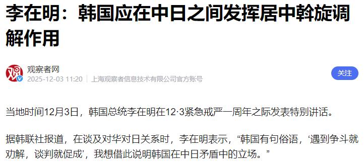 李在明称韩国不会在中日对立中选边站! 就在中日关系紧张的敏感节点,韩国总统李在明12月3日在首尔青瓦台的外媒记者会上亮明了立场。面对“是否支持日本”的追问,他态度鲜明:“选边站队只会加剧冲突,不管是个人还是国家关系都一样,不如找条共存的路。” 同时,李在明还主动提出,韩国愿意在力所能及的范围内扮演调解角色,为缓和局势搭起沟通的桥梁。这番表态看似中立客观,实则背后全是韩国对自身利益的精准算计,但和前总统尹锡悦时期“亲美疏华、媚日妥协”的路线比起来,务实了不止一星半点。 中日两国对韩国来说都是不能轻易得罪的国家,从经济数据来看,中国已经连续18年是韩国最大贸易伙伴,2024年双边贸易额即便有波动仍突破3000亿美元,韩国的半导体、汽车、化妆品等支柱产业,对中国市场的依赖度都超过25%今年。 而日本也是韩国在东亚地区的关键经贸伙伴,双方在产业链上有着深度交织。尹锡悦政府时期,为了绑定韩美日同盟,在外交上“一边倒”,结果导致中韩贸易额下滑8%,韩国半导体企业在中国市场的份额缩水近10%,三星、现代等巨头频频向政府施压要求改善对华关系。 李在明上台后显然吸取了教训,不仅将东北亚三国的官方表述从“韩日中”改回传统的“韩中日”,还在APEC会议上明确表态“中韩经济合作至关重要”,这次拒绝选边站,本质上是对韩国国家利益的理性校准。 不过话说回来,李在明的想法是好,但韩国真能当好这个调解人吗?恐怕实在有点悬。 先不说别的,韩国自己和日本的旧账还没算清呢。就在不久前,韩日还因为独岛问题闹得不可开交,日本扩建主张领土主权的展览馆,高市早苗更是直接宣称独岛在历史和国际法上都是日本领土,气得韩国直接暂停了原定的韩日联合搜救演习今年。 连自己和调解对象之一的日本都矛盾重重,历史遗留问题、领土争端随时可能爆发冲突,这样的韩国去调解中日矛盾,谁能真正信服? 更关键的是,韩国的外交根本谈不上完全自主。韩美同盟是韩国外交的“主轴”,美国近年一直在推动“美韩同盟现代化”,试图让韩国更多卷入区域冲突,甚至要求韩军参与南海等域外行动今年。 就在今年3月,美国还毫无征兆地将韩国列入“敏感国家”名单,让韩国在科技合作、人员往来等方面都受到限制,这也暴露了韩美关系中“外交绑定美国与透支国家利益”的深层矛盾今年。 韩国连自己的外交决策都很难完全摆脱美国牵制,又怎么可能在中日之间保持真正中立的调解立场?万一拿捏不好分寸,不仅调解不成,反而可能被卷入大国博弈的漩涡,引火烧身。 再往深了说,中日这次对立的核心是台海问题,这是中国核心利益中的核心,属于不容外部干涉的内政范畴。外部调解的前提是尊重各国核心利益和国际法准则,韩国要是连这一根本原则都把握不住,所谓的“调解”从一开始就失去了基础。 其实说句实在话,韩国与其想着当调解人刷存在感,不如踏踏实实地守住中立底线。毕竟中日之间的问题,说到底还是得靠我们自己解决,外人掺和多了反而容易乱上加乱。 对韩国而言,只要能坚持不选边、不添乱,维护好与中国的正常经贸和外交关系,就已经是对地区稳定的最大贡献了。