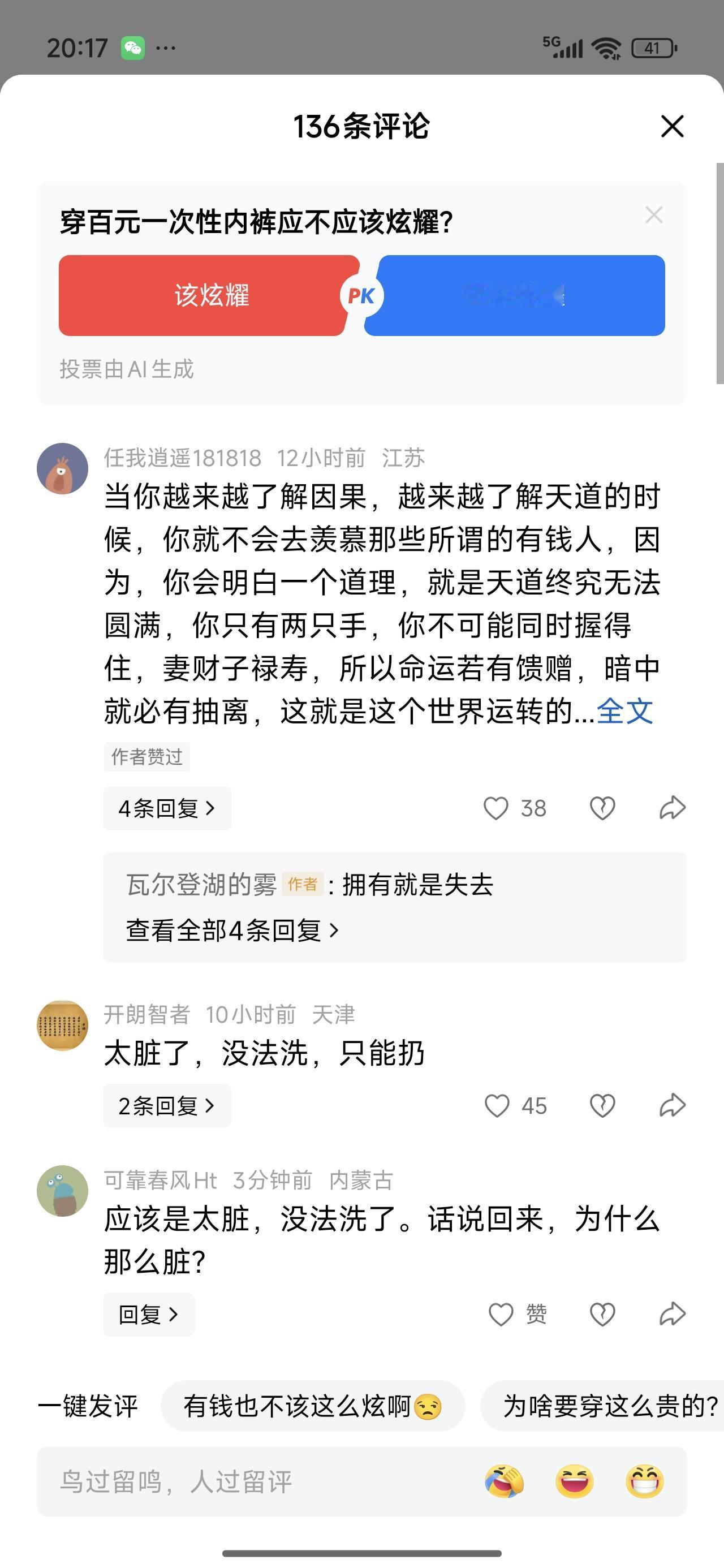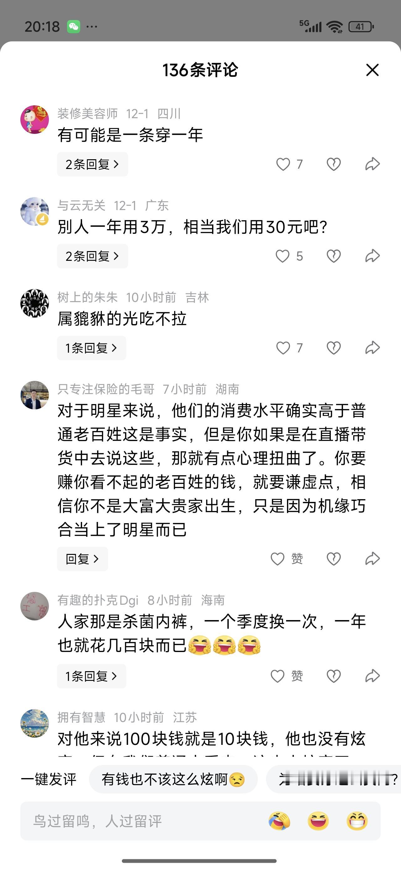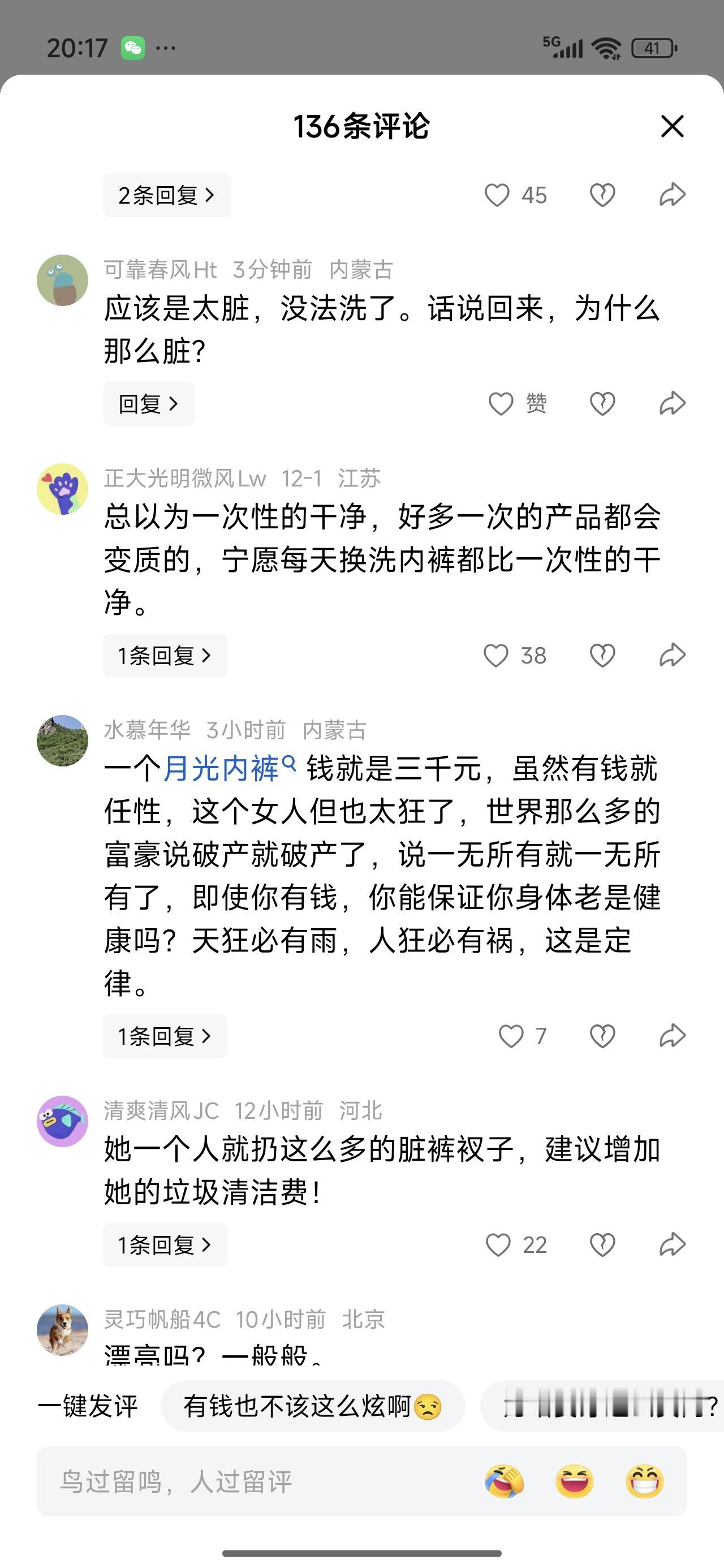 董璇听李雪琴的建议,用一次性内裤代替手洗。节省下来的时间干别的。 明星有那么忙吗?可能吧!钱都是时间去赚的。 但你知道她的一次性内裤多少钱吗? 真是颠覆了我的想象。100块一条。100块钱的内裤,普通人,能用半年。 我这两天不太舒服。我扔了几条。觉得时间长了。还是换一批吧!大概有一年了吧! 其实知道明星会很奢靡,但不知道钱是这么花的。一年三万块的内裤钱,赶上我一年的工资。真是好神奇啊! 三万块钱,买不来人家一件上衣。其实来讲,真的无所谓! 但是,我不想听到这件事,不想知道人家一条内裤100块钱,我得用一天的时间去挣。太心酸了。人比人得死,货比货得扔。 一比较,生而为人,太寒酸了?