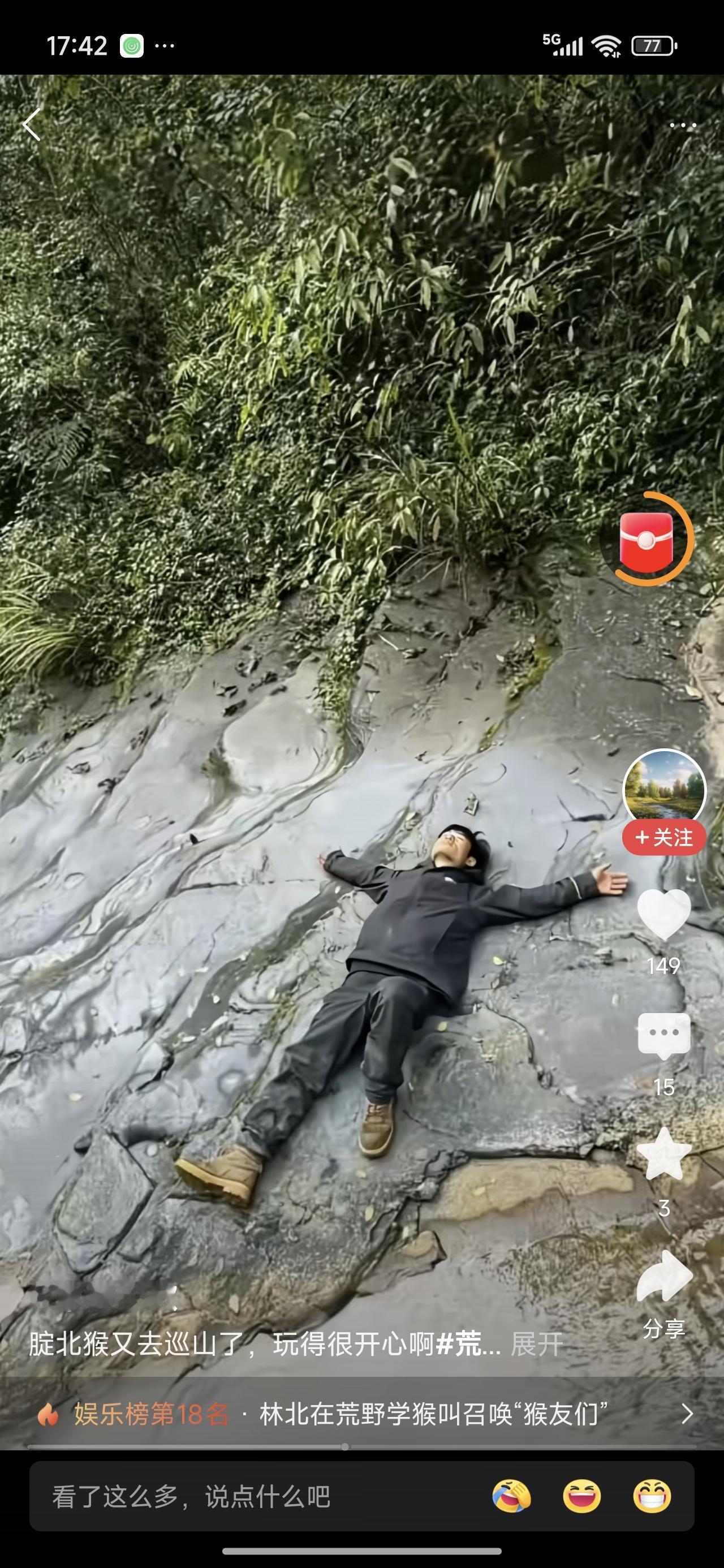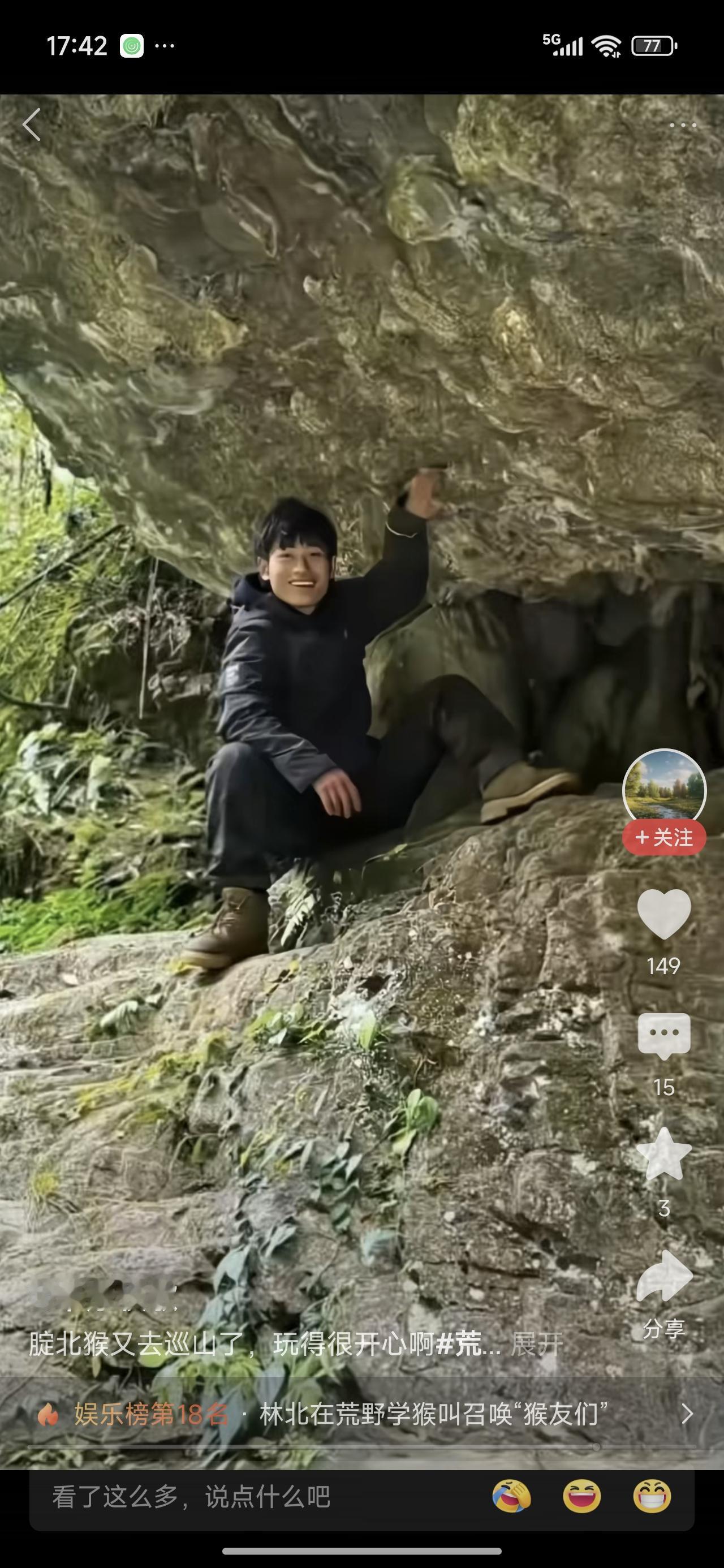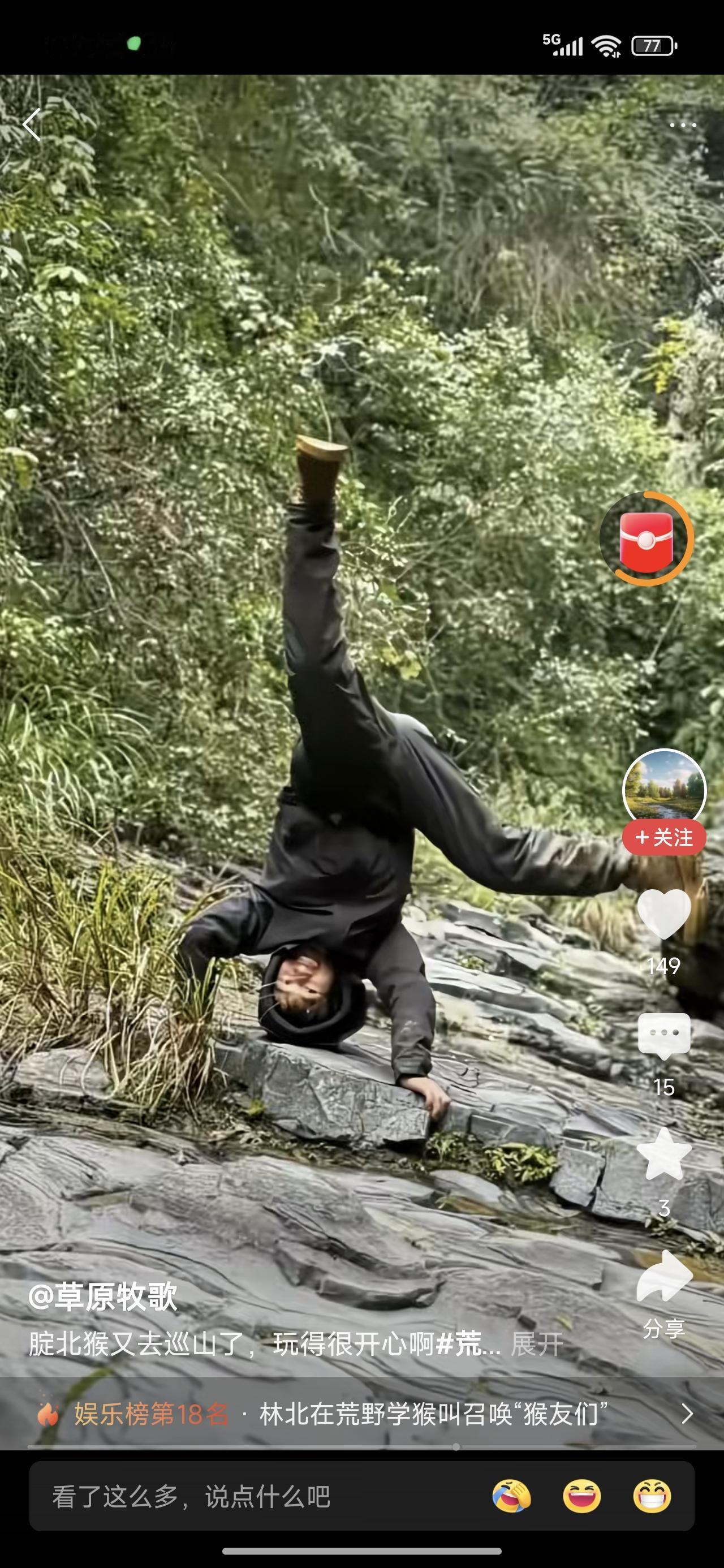 定北侯又去巡山了!别说节目组投喂了,就这么出片,让他吃吧!吃了他真返祖,跟猴子交流,跟大自然对话。多好看啊! 他不是奔着冠军去的,他是去带你找回你自己。你看他,高兴不?高兴是件很美好的事情。 这个视频,我看了五遍,收藏着,等不知道想干什么自己会高兴了,就翻出来看看。看了他,真的很开心。谢谢林北女朋友开发的定北侯,这么好玩。祝福你们哦!要幸福哦!