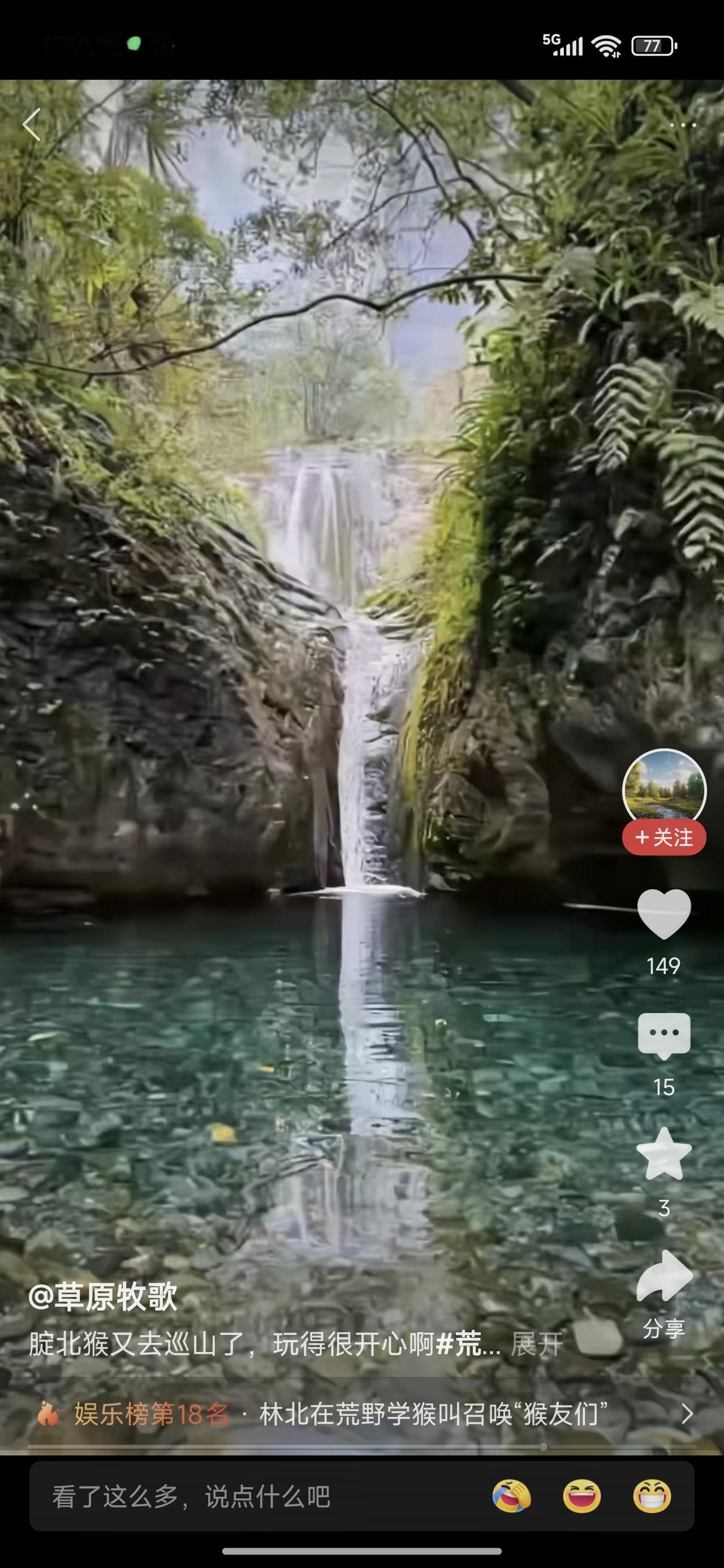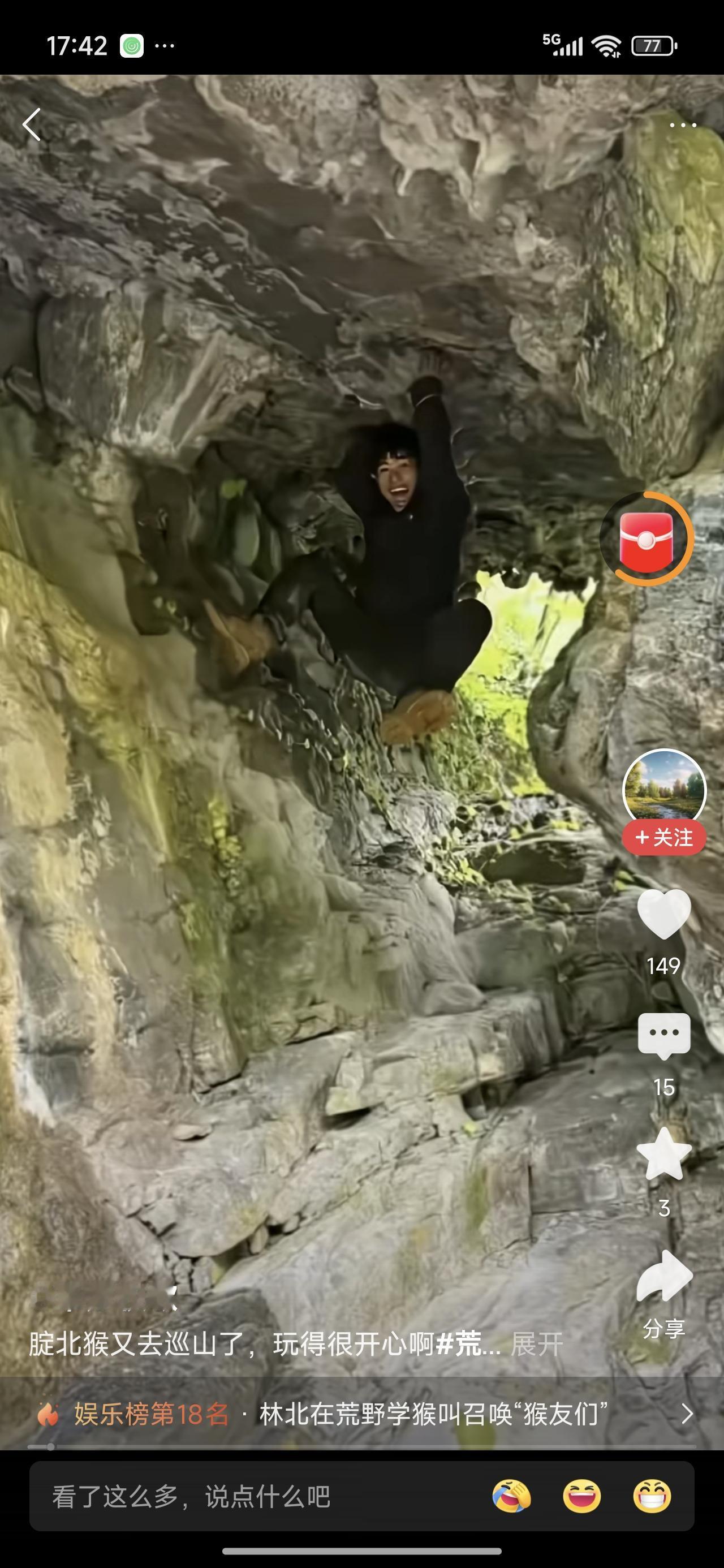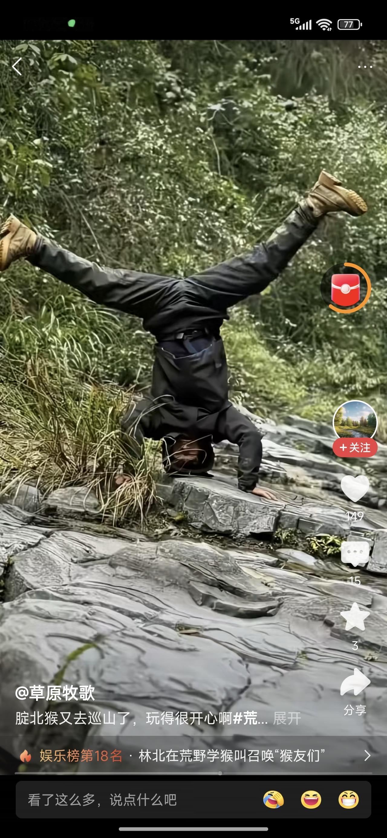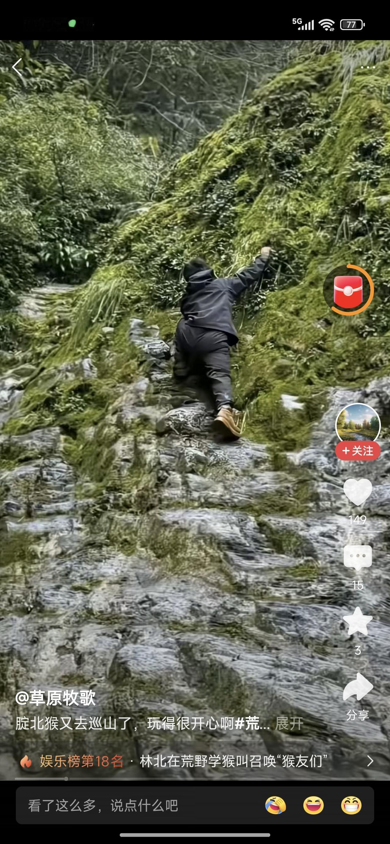 定北侯又去巡山了!别说节目组投喂了,就这么出片,让他吃吧!吃了他真返祖,跟猴子交流,跟大自然对话。多好看啊! 他不是奔着冠军去的,他是去带你找回你自己。你看他,高兴不?高兴是件很美好的事情。 这个视频,我看了五遍,收藏着,等不知道想干什么自己会高兴了,就翻出来看看。看了他,真的很开心。谢谢林北女朋友开发的定北侯,这么好玩。祝福你们哦!要幸福哦!