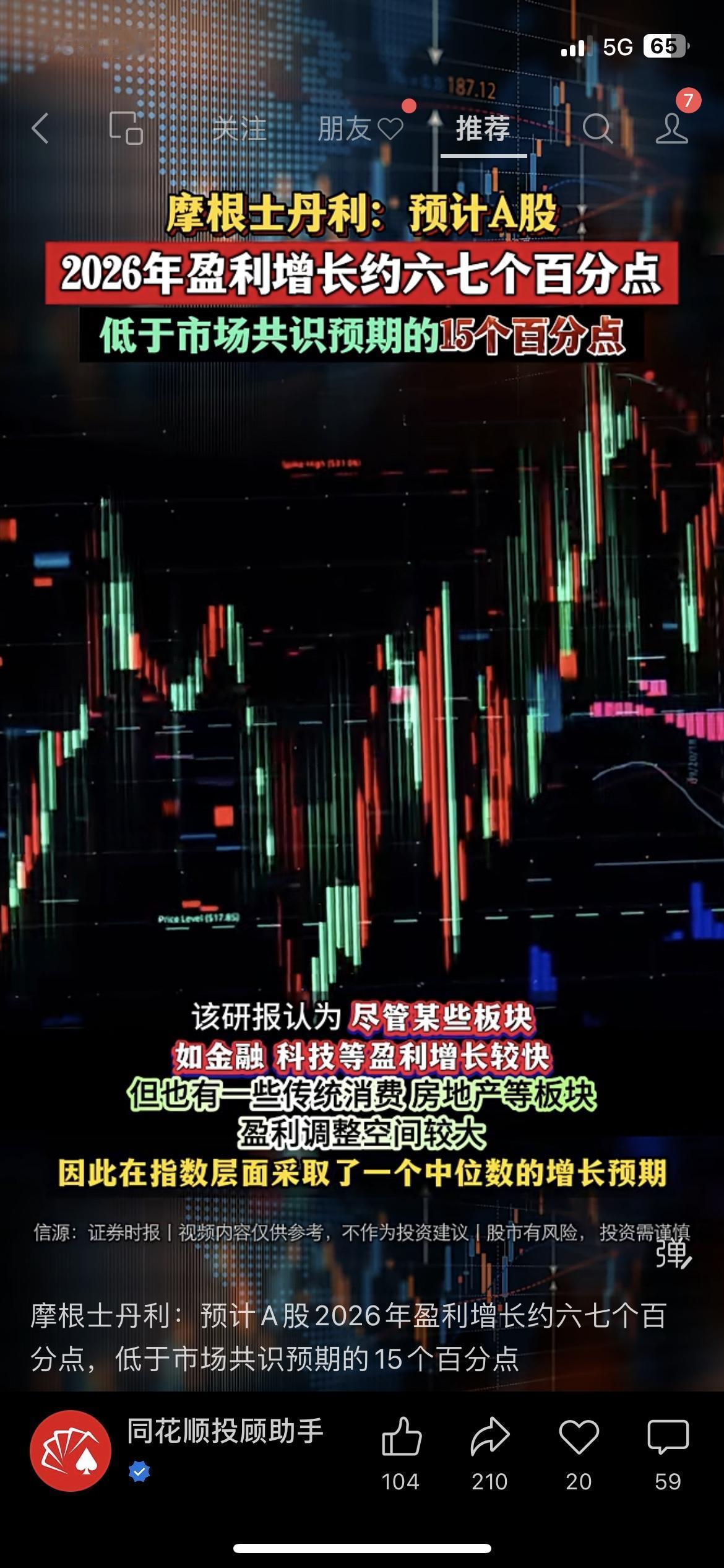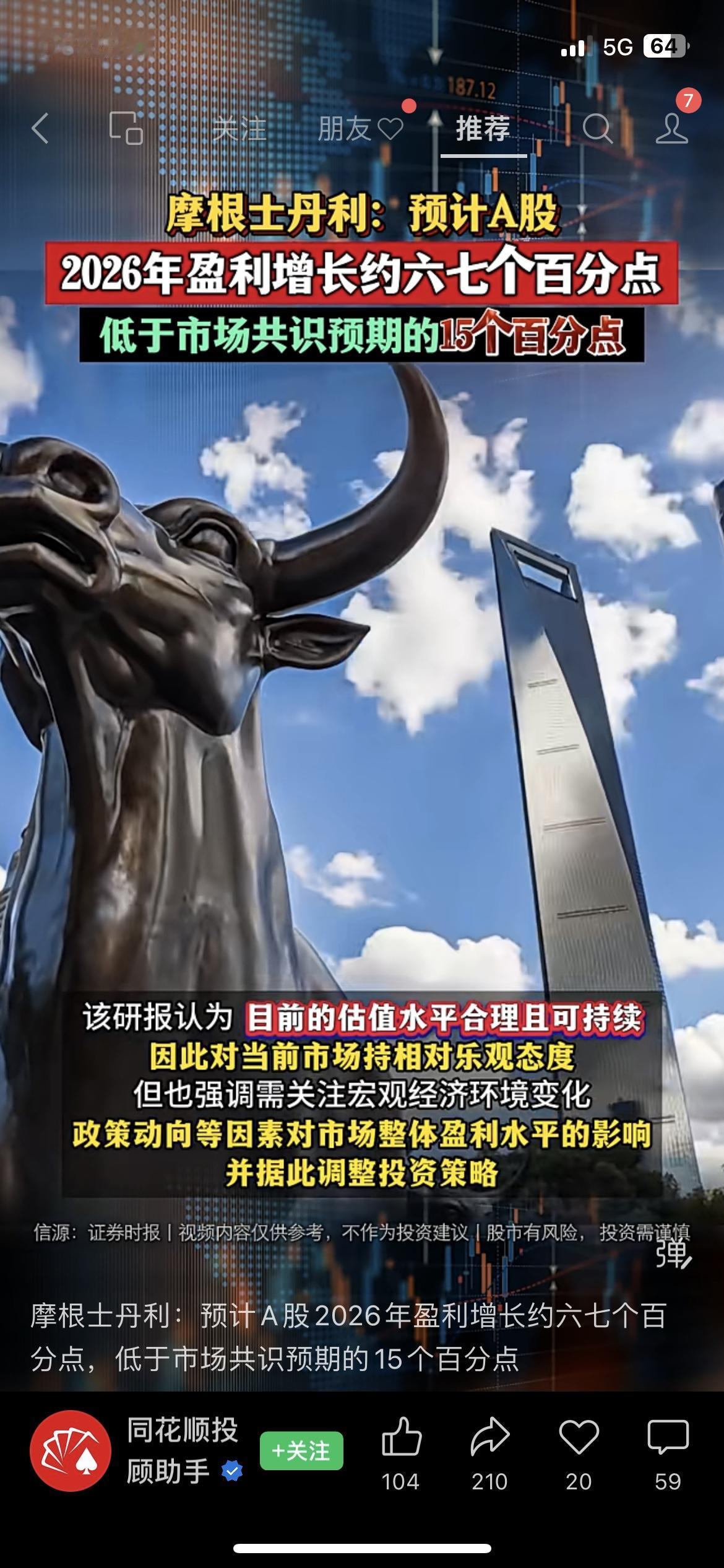 大摩给A股2026年盈利泼冷水?但这态度反而让人安心… 刚刷到摩根士丹利的最新研报,看完第一反应是“这预测有点保守啊”!人家明确说,A股2026年盈利增长大概就6%,比市场普遍预期的15%差了快一半,相当于直接给过热的预期降了降温。 但别慌,人家可不是唱空!反而强调现在A股估值特别合理,对当下市场还挺乐观的。核心原因就是板块分化太明显:金融、科技这些赛道涨得猛,盈利能扛住;但消费、地产还得慢慢调整,所以指数层面才取了个中间数。而且报告还给出了沪深300指数年末目标位4840点,算是有具体方向了。 其实机构预测这事儿,咱们重点看逻辑就行,毕竟市场是走一步看一步的。你们觉得大摩这波“降温”靠谱吗?明年你更看好哪个板块?评论区聊聊~ A股 机构研报 投资理财A股股市分析