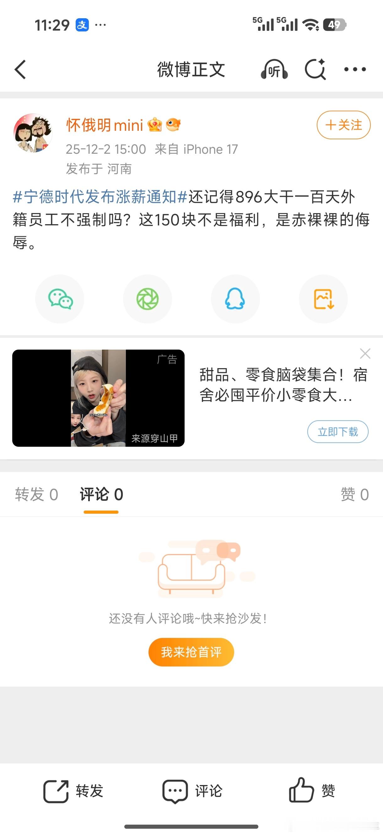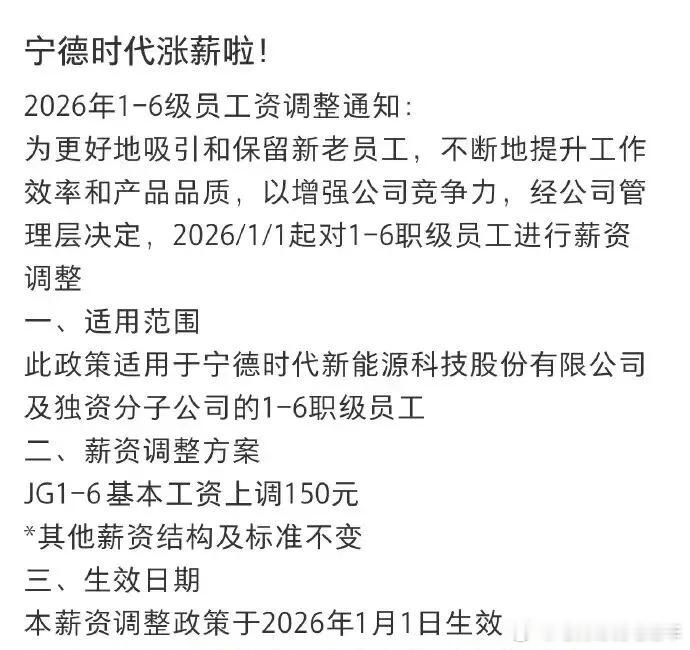 宁德时代给全员涨薪!1-6职级基层员工每月涨150元,明年1月1日生效。今年前三季度,宁德时代净赚490亿,平均每天净赚1.8亿。所以评论区有点两极分化,一边是觉得涨总比不涨好,一边是嫌太少。大家怎么看?根据去年财报显示,宁德时代全体员工数为13.2万人,人均薪酬为23.63万元,较2023年上涨1.06万元。宁德时代宁德时代涨薪汽车