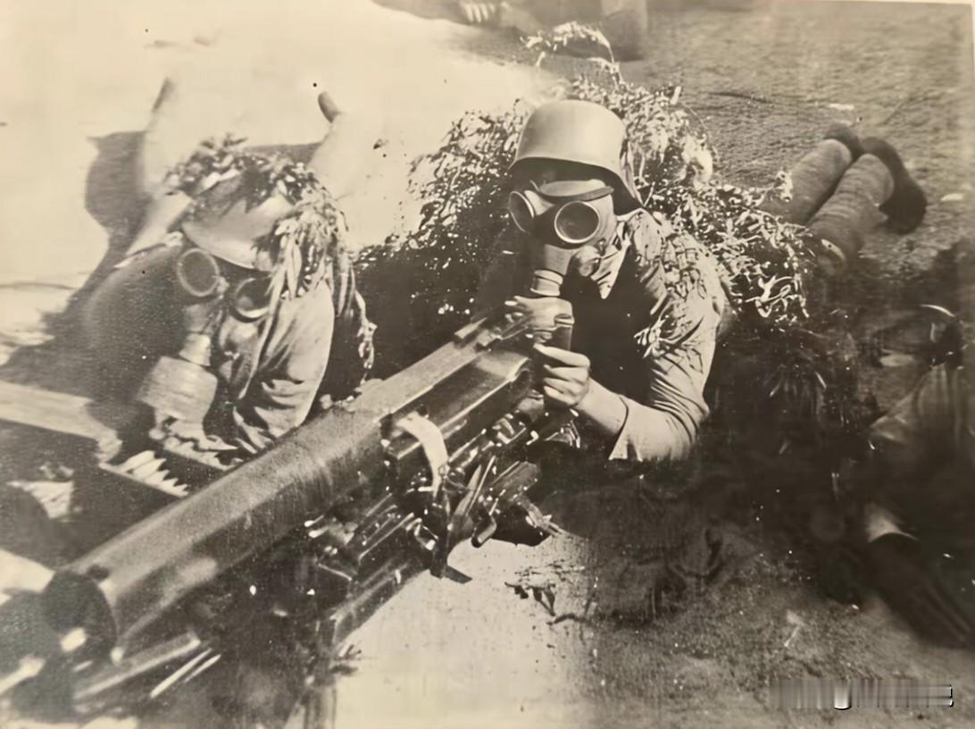 大家注意看,这才是真正的国军精锐部队,淞沪会战时,国军德械师的两名士兵的装备刷新了我们对国军的认识,只见他们头戴防毒面罩,面前的马克沁重机枪正在射击进攻的日军,据说他们隶属于张治中将军的第九集团军,它下辖第87师(王敬久)、第88师(孙元良)、第36师(宋希濂),均为中央军德械精锐师,是会战初期主动攻击的核心力量。