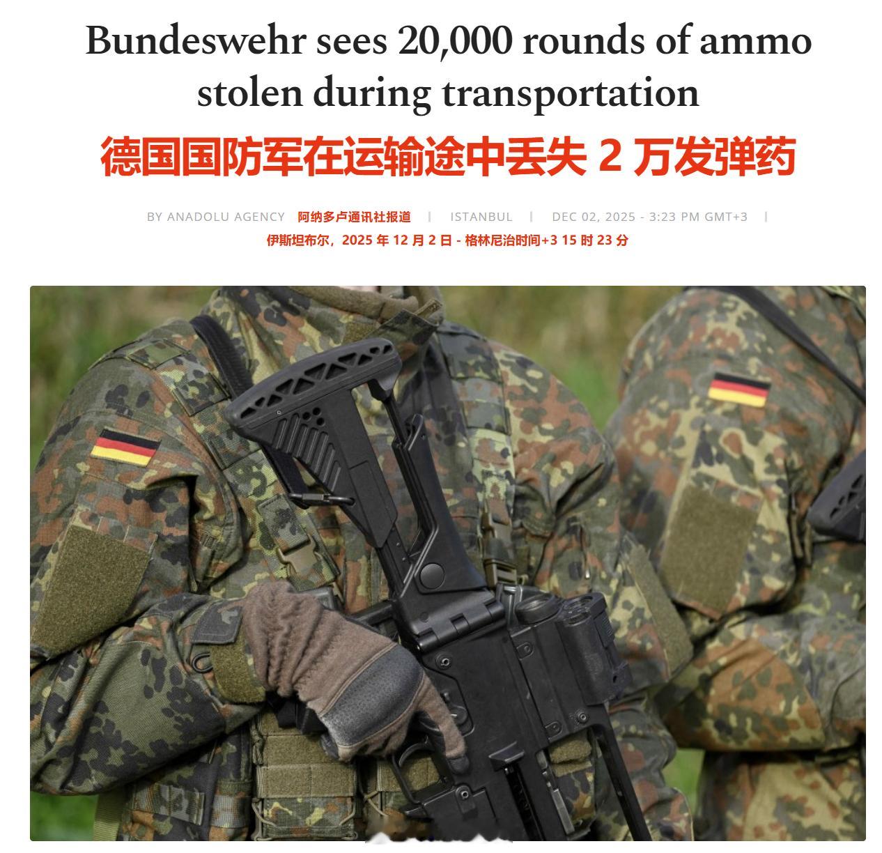 德国国防军在运输途中被偷了2万发弹药。德国国防部周一向《明镜周刊》证实,德国军方约 2 万发弹药在民用卡车运输途中被盗。初步报告显示,上周一至周二夜间,一家与军方签有运输合同的民用运输公司司机将满载的卡车停放在无人看守处,不明身份者趁机窃取了约 2 万发联邦国防军弹药。这辆卡车当时停放在东北部布尔格镇附近工业区的一处未设防停车场,夜间货厢遭人闯入,数箱军用弹药失窃。据报道,约 1 万发实弹手枪子弹、9900 发突击步枪训练弹以及所谓的烟雾弹被盗。国防部发言人将此事件描述为严重的安全漏洞,并指出此类弹药"绝不能落入不法之徒手中"。国防部强调,这家民用运输公司在计划外的过夜停留期间,未按规定安排人员看守载有联邦国防军弹药的卡车,违反了安全协议。随着调查的持续进行,军方消息人士推测,此次运输可能事先被盯上,作案者是在司机于布尔格市计划外停车期间实施盗窃,而非随机抢劫。海外新鲜事