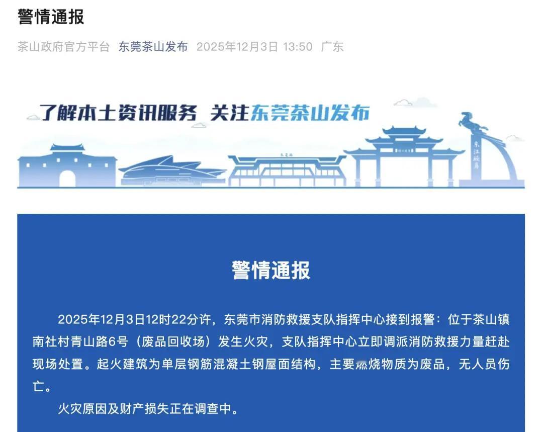 今日火情!时间:12月3日12点22分左右。地点:广东东莞市茶山镇南社村青山路6号(废品回收场)。损失:废品及部分建筑。人员伤亡情况:无人员伤亡。火灾原因:调查中。特别提醒:天干物燥,小心火烛。热点 今日火灾最新消息 广东东莞市茶山镇一废品回收场发生火灾