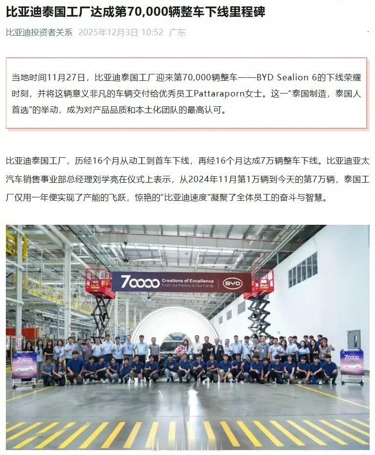 比亚迪泰国工厂达成第7万辆整车下线里程碑。比亚迪308_IO新能源汽车