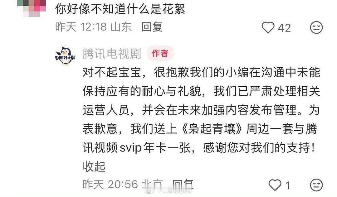 腾讯电视剧道歉 腾讯电视剧就昨天的怼粉言论道歉了,现在怎么开始流行官号运营下场表达自己的喜恶了,真的很没有职业道德,皮一股业内傲慢看不起观众的登味儿,只能通过道歉紧急公关平台自己挽回脸面,zb和平台什么时候才能记住,观众才是老大,别老教育付你💰的人,拿这个来嘲迪丽热巴的更是无大语