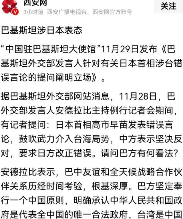 巴基斯坦给日本的压力要比俄罗斯还大!11月28日巴基斯坦外交部发言人安德拉比表示,巴方反对任何制造'两个中国'或'一中一台'的企图。 2025年11月,日本首相高市早苗把“台湾有事”公开升级成“日本存亡危机事态”,等于把自卫队可能出手的牌亮在了桌上。中国这边直接炸了锅,三天两头召见日本大使,俄罗斯扎哈罗娃更是连着三天点名开火,军国主义、二战教训,全给日本扣上去了。东京听完最多耸耸肩,反正俄日早就不对付,北方四岛的账还没算,经贸往来基本为零,骂得再狠也只是隔空放炮,日本左耳进右耳出。 巴基斯坦却只在11月28日记者会上,面对新华社记者的提问,平静地说了那句:反对任何制造“两个中国”或者“一中一台”的企图。没点名日本,没上纲上线到历史,没带一个脏字,却让东京外务省当晚就紧急开会评估影响。 原因太现实了。日本在巴基斯坦赚得太多。丰田在卡拉奇的组装厂占当地新车市场三成,住友、三菱在瓜达尔港、卡洛特水电站的输变电项目里投了真金白银,两国税收协定里12.5%的特许权使用费优惠,每年帮日本企业省下几亿美元。 巴基斯坦只要在任何一个项目环评上稍微卡一卡,或者在税收执行时严格起来,日本企业立刻就得吐血。更别提市场信心一旦崩盘,日系车在巴基斯坦消费者心里的地位立马下滑。东京最怕的就是这种“看不见的刀”。 俄罗斯的批评是明火,日本早有心理准备;巴基斯坦这句表态却是把刀悬在日本钱包上,随时可能落下。日本越是经济复苏吃力,越是需要巴基斯坦这种高增长市场,痛感自然比俄罗斯的空吼深十倍。
