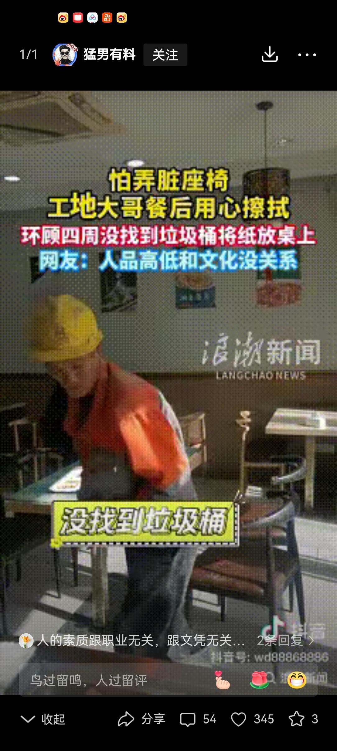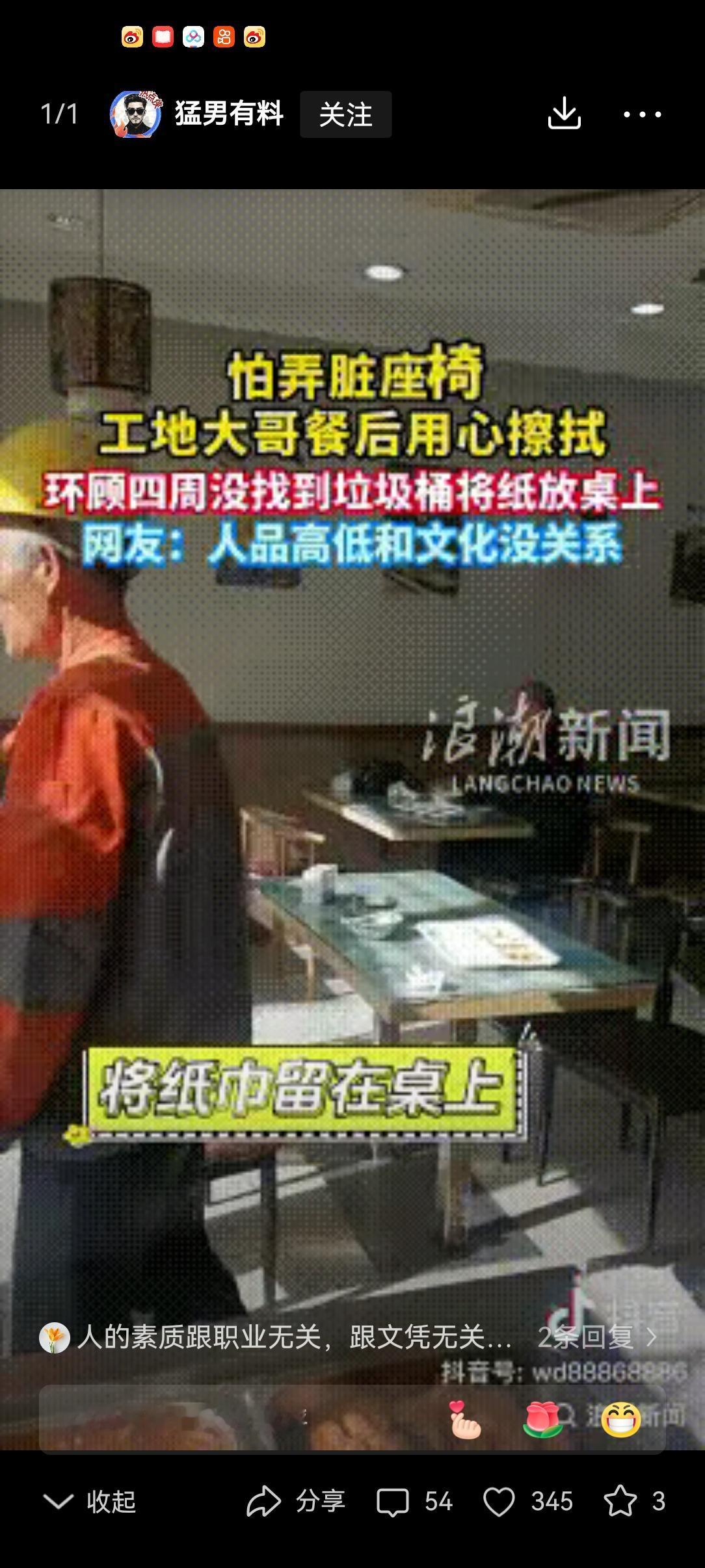 “素质,跟有没有钱没关系。”上海一农民工大叔在一家餐馆吃完饭后,顺手又抽了一张纸巾,本以为大叔要离开了,谁料,大叔竟弯下腰用纸巾将自己坐过的椅子,擦拭干净! 谁能说素质是有钱人的专属?上海餐馆里,一位农民工大叔的举动,给所有人上了一课。 他穿着沾着水泥灰的工装,黄色安全帽放在桌角,刚扒完最后一口饭,便抽了张纸巾。 没人想到,他没擦嘴,反倒弯腰俯身,把自己坐过的椅子,里里外外擦得干干净净。 椅面的饭粒、缝隙里的碎屑,都被他细细拭去,动作笨拙却格外认真。 擦完椅子,他攥着脏纸巾在餐馆里寻了一圈,没找到垃圾桶,便轻轻放在桌角,摆放得整整齐齐才转身离开。 餐馆老板无意间拍下这一幕发到网上,很快刷屏全网,暖了无数人的心。 有网友留言:“真正的素质从不是穿名牌、讲排场,而是刻在骨子里的体谅。” 也有人分享经历:“上次见外卖小哥在面馆休息,起身前也擦了座位,平凡人最懂换位思考。” 想起鲁迅说的,真的猛士,敢于直面平凡,也敢于坚守本心。大叔的举动虽小,却藏着最珍贵的修养。 素质从来与身份无关、与财富无关,不是西装革履的伪装,而是发自内心的自觉与善良。 它不需要惊天动地,不过是起身擦净一把椅子,不过是妥善处理一张纸巾。 愿这样的微光能照亮更多人,愿我们都能从细微处做起,做一个心有温度、行有教养的人。 你们身边有没有这样温暖的小事?欢迎在评论区聊聊~