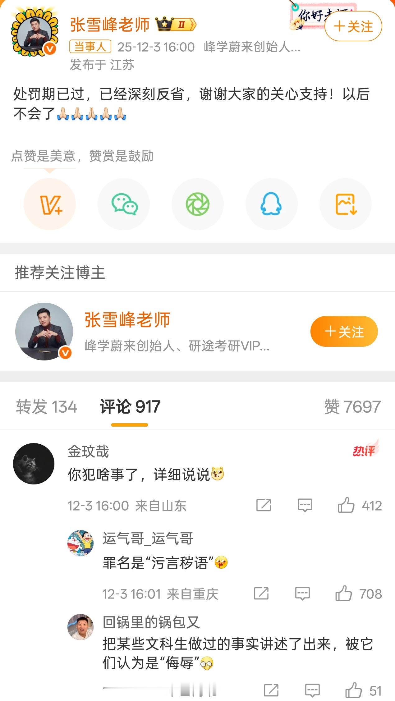 张雪峰称已经深刻反省作为公众人物,还是得谨言慎行,毕竟能影响到更多人。张雪峰老师很多观点还是不错的,深刻反省,认真悔改是很有必要的。还有现在大家接受网络上杂乱信息还是得多思考思考,认真分辨,别被带偏。