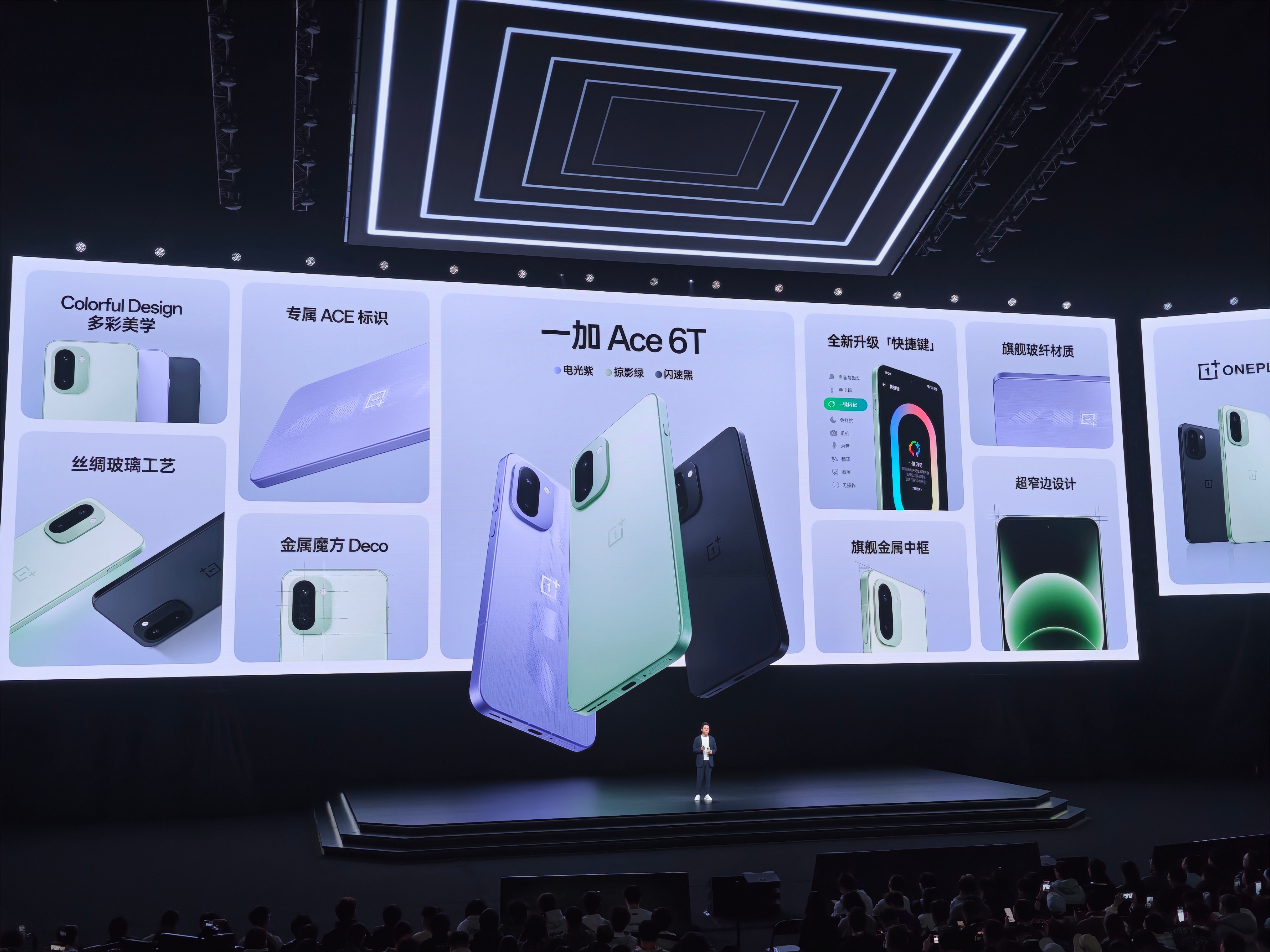 一加Ace6T新品发布发布会开始了,今年一加手机整体的销量数据还不错,增速是全行业第一。今天发布的一加Ace 6T主打性能旗舰,外观上采用家族式设计,金属Deco+金属中框,超窄边框直屏,带来掠影绿、闪速黑、电光紫三款配色大家喜欢哪个配色?