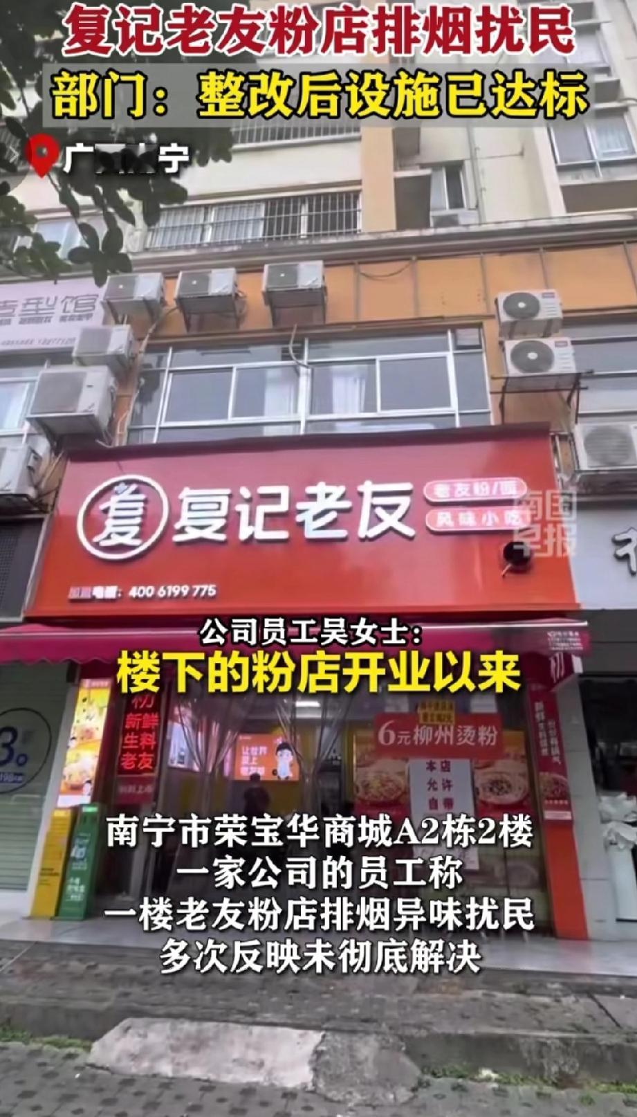 近日南宁市荣宝华商城A2栋2楼的公司员工反映,一楼复记老友粉店开业后油烟一直办公室,长期吸入入对身体影响大,多次反映未彻底解决。事后涉事店家赵先生称已两次整改,现在使用的排烟系统经检验合格,且物管方无权改变经营业态,油烟问题难避免。金凯街道办指出因楼栋无餐饮专用烟道致油烟回流,已促成临时整改;江南区综合行政执法局表示店家已装油烟净化设施且排放达标,将持续督促合规经营。(来源于@南国早报 )