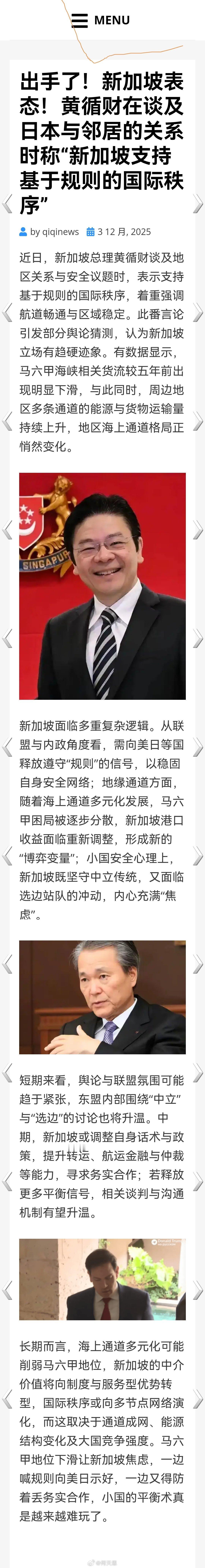 新加坡表态了!黄循财在谈及日本与邻居的关系时称“新加坡支持基于规则的国际秩序”。高市早苗终于不嘴硬了特朗普点名日本海外新鲜事何天恩