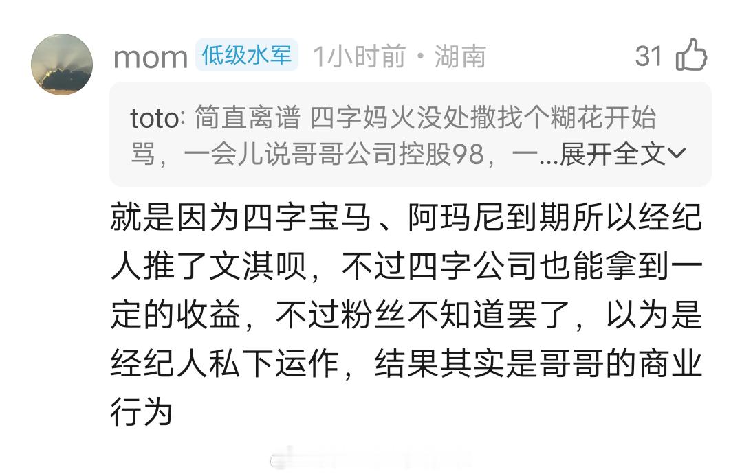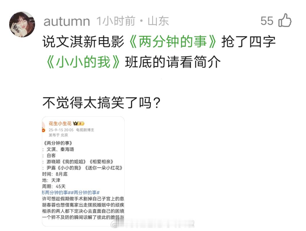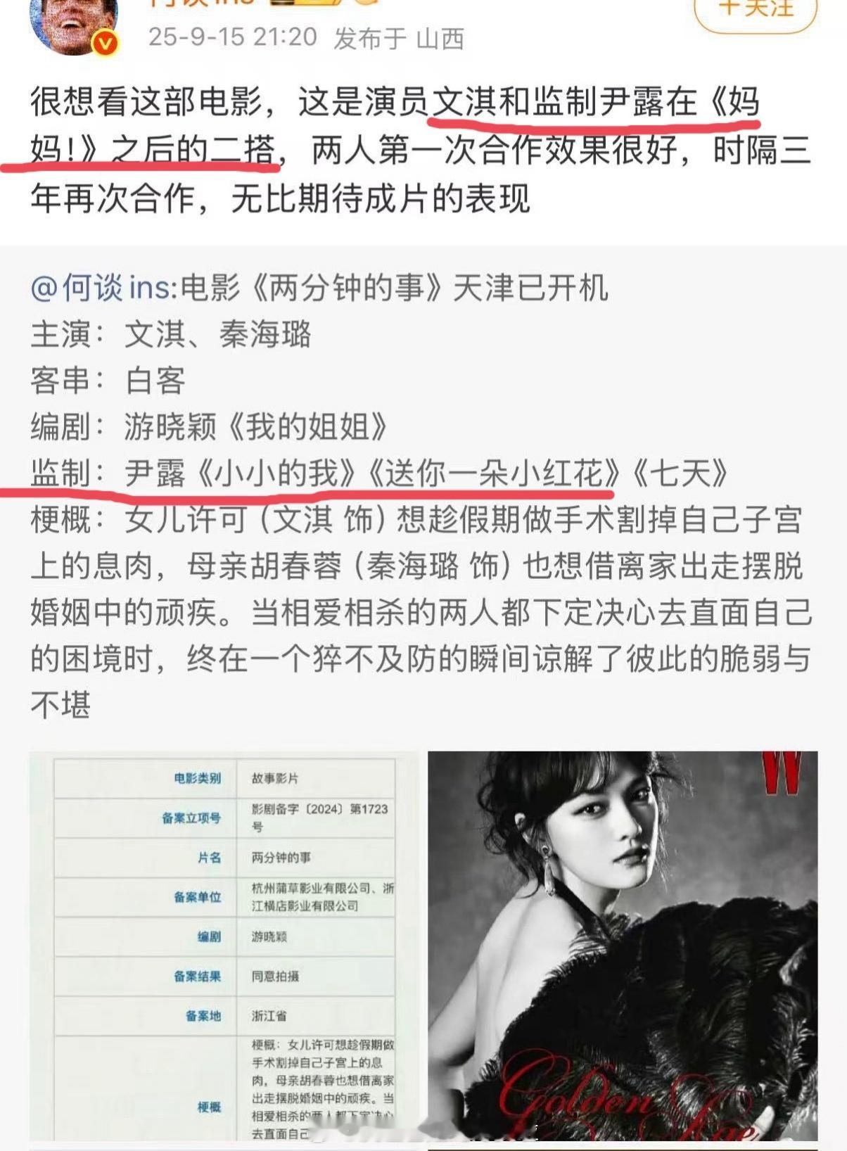 电影博主爆料文淇合约仍在原公司,易烊千玺经纪人负责代理她的经纪事务,并不是猜测的项目私活,易烊千玺公司也有收益。制片人尹露20年和千玺合作《送你一朵小红花》,22年和文淇合作《妈妈!》,24年和千玺再次合作《小小的我》,然后文淇和尹露二搭《两分钟的事》,应该算不上捡漏抢班底。小小文淇 签约公司是终身大事易烊千玺文淇 经纪人
