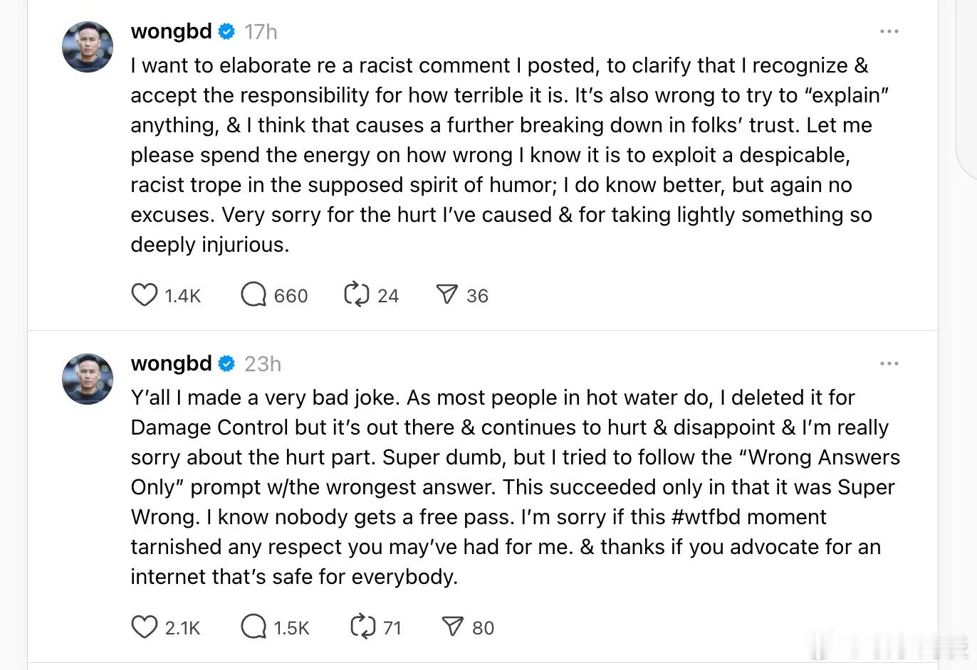 黄荣亮(BD Wong)在社交媒体上发表“种族歧视言论”后,在Threads上发布了一篇长篇道歉声明。这位出演过《法律与秩序》和《侏罗纪世界》的演员,在Mike Holston(拥有1600万Instagram粉丝)的一条帖子下评论后,引发了强烈反弹。Holston是黑人,他发布了一张与动物的合照,并配文:“说出这是什么动物……只接受错误答案。” 据称,黄荣亮在一条已被删除的评论中回复道:“看起来像个黑人。”“各位,我开了一个很烂的玩笑,”黄在评论开始在社交媒体上疯传后,在Threads上写道。“就像大多数惹上麻烦的人一样,我为了挽回局面删掉了它,但它已经流传开了,继续伤害和让人失望,我对造成的伤害真的非常抱歉。我真是蠢透了,但我试图按照‘只回答错误答案’的提示,给出一个最错误的答案。结果它只是错得离谱而已。我知道没有人能免责。如果这个wtfbd时刻损害了你们对我的任何尊重,我深表歉意。感谢你们支持一个对每个人都安全的互联网环境。”几个小时后,这位演员补充道:“我想就我之前发表的种族歧视言论做进一步说明,澄清我认识到并接受其恶劣后果的责任。试图‘解释’任何事情都是错误的,我认为这只会进一步破坏人们之间的信任。”“请允许我把精力放在我明知以幽默之名利用卑劣的种族主义老套路是多么错误上;我当然明白这样做不对,但再次声明,我没有任何借口。对于我造成的伤害以及我对如此伤人的事情掉以轻心,我深感抱歉。”黄总结道。华裔在美国