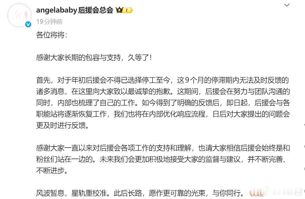“等了整整9个月,终于等到你!” 2025年12月3日,Angelababy后援会总会官宣恢复运营,各职能站同步重启,瞬间点燃粉丝圈。 2025年初,受2024年末舆论风波影响,Angelababy后援会突然停摆,长达9个月未能正常响应粉丝需求。 12月3日,后援会发布复工公告,致歉之余透露,停工期间始终与艺人团队保持沟通,此次重启是“得到明确反馈”后,双方达成协作共识的结果,承诺将优化响应流程,衔接好粉丝与团队的沟通桥梁。 而在复工前,粉丝已通过请杨颖工作室正视粉丝诉求话题持续维权,核心诉求包括重组内地团队、恢复后援会运作等,后援会复工正是粉丝重点呼吁的诉求之一。 有网友表示:“终于等到复工!超话头像该换了,生日应援也可以安排起来了”,直言终于有了“正规组织”,期待后续行程同步更及时; 也有网友说:“别只喊口号,之前团队对接慢、信息滞后的问题得真解决”,担心复工只是形式,核心诉求仍得不到落实; 在我看来,后援会复工绝非单纯的粉丝组织重启,而是Angelababy事业“回血”的重要一步。 2024年末的舆论风波让她遭遇代言危机,43个代言面临撤换风险,综艺片段被打码,事业陷入低谷。 但近期她的资源已现回暖迹象:2025年10月新增企鹅户外全球代言人,骆驼品牌续约升title,网传还将登《芭莎艺术》封面、接洽悬疑微短剧,商务与影视时尚资源同步发力。 后援会作为艺人与粉丝的核心纽带,其重启意味着团队愿意重新搭建与粉丝的沟通渠道,这既是安抚长期维权的粉丝,也是为后续的作品宣传、品牌联动铺路。 最后……来聊聊你的看法~👇 1. 你觉得Angelababy 2026年能成功“翻红”吗? 2. 你最期待她后续往影视、时尚还是综艺方向发力?