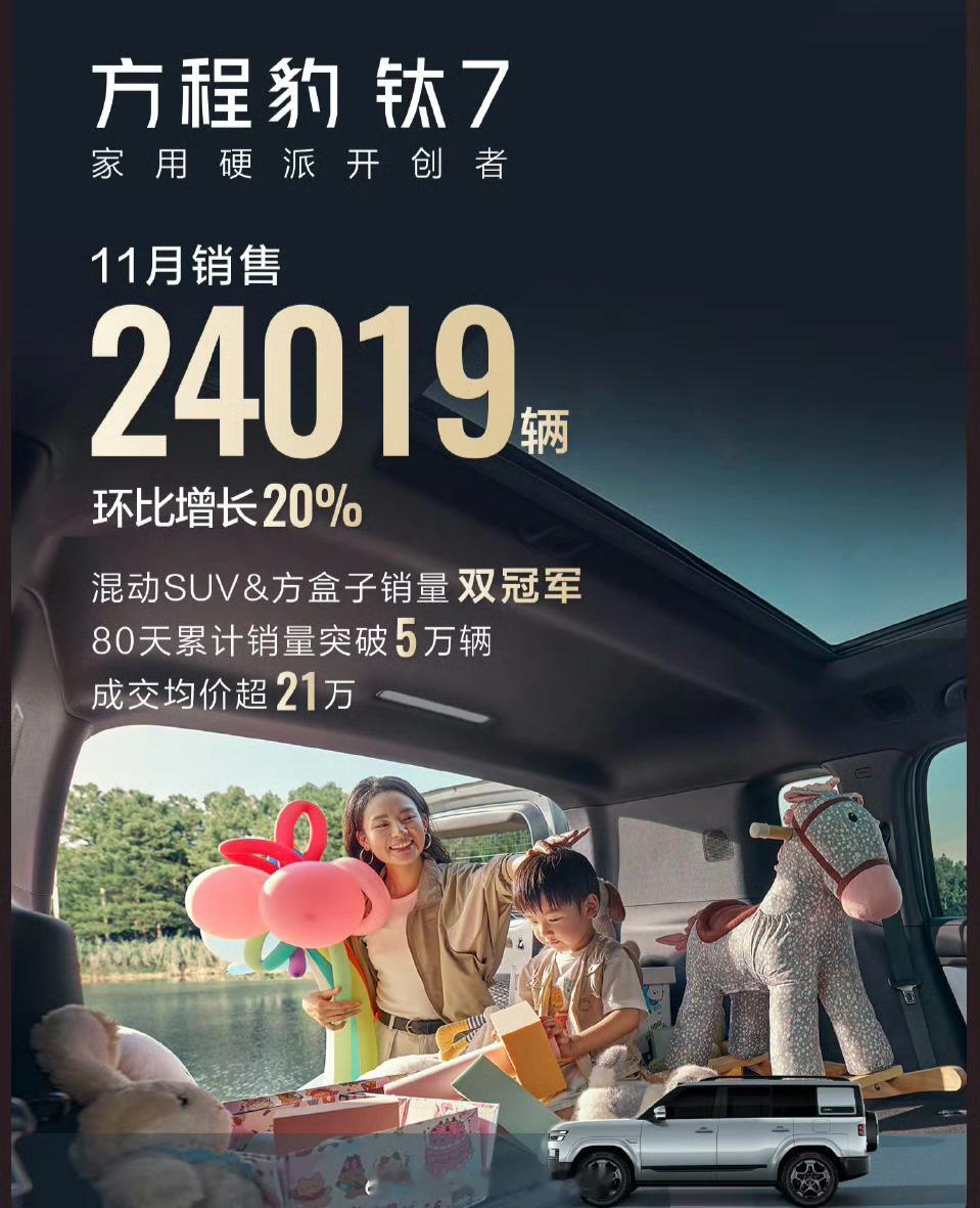 方程豹汽车方程豹是真起来了11月销售37405辆环比增长20.5%,同比增长339%品牌累销超24万辆,成交均价近24万元尤其是钛7,混动SUV&方盒子双冠军10月份方程豹钛7卖出了20024辆11月销量24019辆,成交均价超21万元 卖得越来越多了这是要知道这可是17.98万-21.98万的方盒子车型不便宜的车,以往不主流的车型能卖出不简单的销量能看出方程豹是有点实力的拥有全球首创的全速域轮端解耦技术全速域范围内无感切换两驱和四驱前双叉臂+后五连杆的独立悬架不管什么路况都能指哪打哪更重要的是 ,钛7的完全没有牺牲舒适性冰箱彩电大沙发都有还搭载比亚迪的云辇-C智能阻尼车身控制系统、云辇预瞄系统连晕车问题都照顾到了,乘坐体验那是十分舒适。好开好坐好玩把小众车型走进主流方程豹现在的成功也不算意外了汽场全开钛7