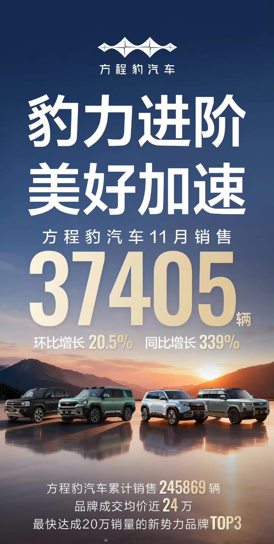 方程豹汽车方程豹是真起来了11月销售37405辆环比增长20.5%,同比增长33
