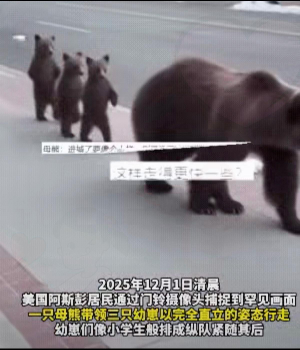 这熊家三口也太会“入乡随俗”了吧!熊妈妈带着三个崽崽逛小镇,崽崽们居然都站直了两条腿走路,这是把“熊样”抛到脑后,要学人类过日子了? 都说熊是冬眠动物,可现在冬天都到了,它们不仅不睡,还敢闯小镇“逛街”,这变化也太颠覆认知了!其实这哪是熊进化了,分明是人与自然的边界在悄悄融合——小镇越来越热闹,熊的生存空间有了变化,它们也在学着适应人类世界。 但话说回来,熊再乖巧也是野生动物,近距离接触还是有风险。这种“和谐同框”看着有趣,背后其实需要人和动物互相尊重边界。别让好奇变成打扰,也别让熊的“适应”变成安全隐患。 你觉得熊闯进小镇是好事还是坏事?如果遇到这样的场景,你会怎么做?来评论区聊聊~熊孩子的父母 熊逛街 熊氏一家