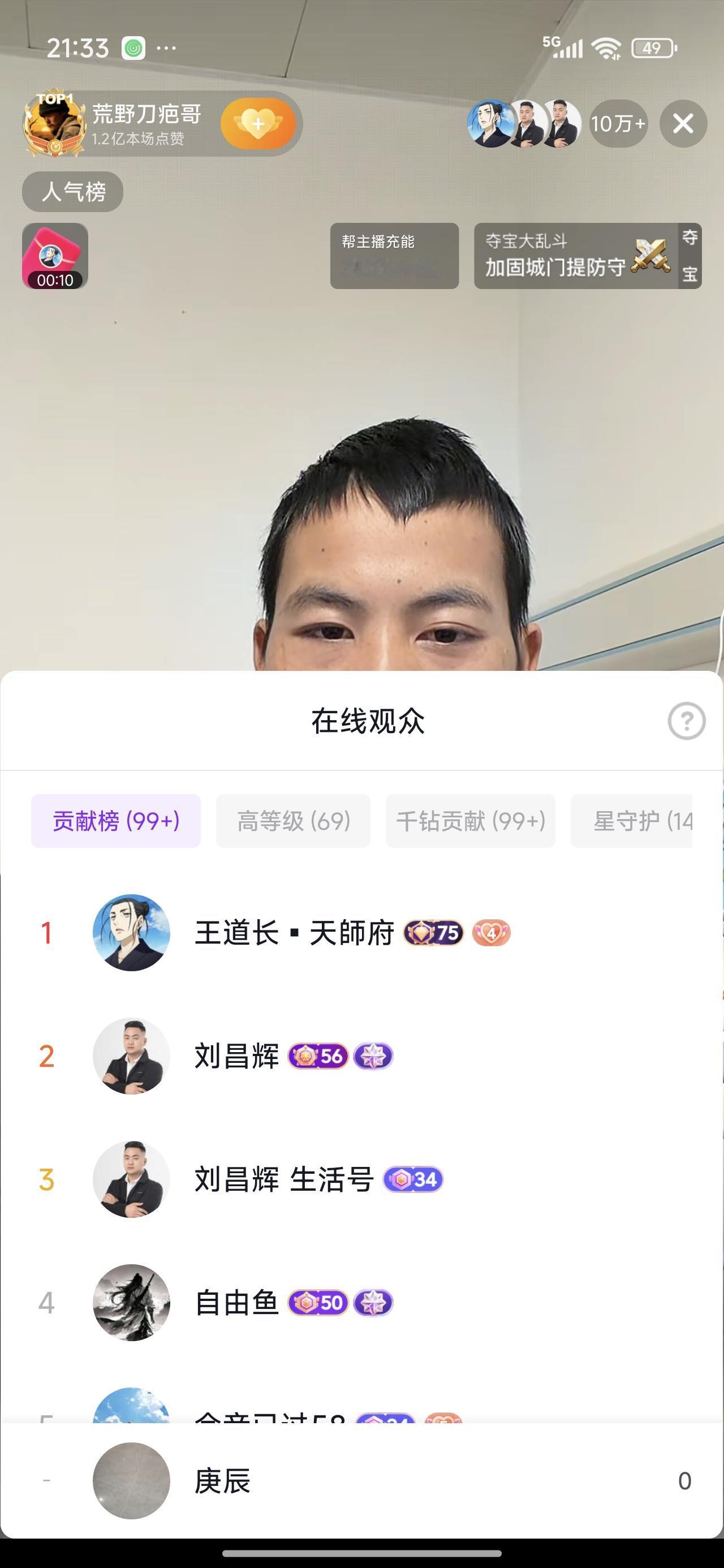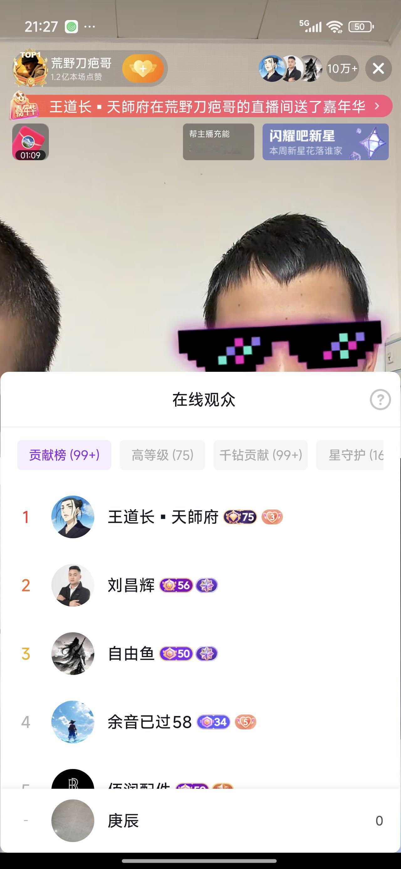 刀疤哥真有排面,有个叫王道长.天师府的75级大佬来给刀疤哥刷礼物!嘉年华一个劲儿的飘。我查了一下,75级,要刷2000万才能升到75级。 今晚的刀疤哥,堪比顶级女主播。我滴妈呀!这个吸粉能力,截止21:37分,已经36万粉丝了! 他的粉丝连线,都说几句话就下去了,很有礼貌。狠狠喜欢他