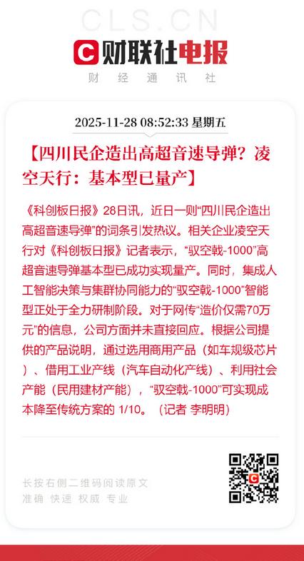 试过几百种材料都没想过用水泥!美国会被活活气死,当凌空天行告诉大家高超音速导弹的防热层是水泥解决的,相信全世界都是懵逼的,高超音速这种超级高大上的武器,中国民企竟然极端粗暴的用水泥解决,并且成本做到了极致化,只有东风系列同类导弹的1/10! 故事的起点藏在一间堆满建材样本的仓库里。 凌空天行的工程师老王蹲在角落,手里捏着块改性发泡水泥样品,指尖划过灰蒙的表面——没人想到,这块看起来像铺路剩下的材料,会成为高超音速武器的“防火衣”。 11月28日,厂商公开宣传片细节时,外界还以为是后期特效穿帮。 直到技术白皮书披露:“驭空戟-1000”的防热层,确实是浇筑成型的水泥基复合材料。 这真的能行吗?——质疑声几乎同时响起。 传统航天工业字典里,防热层该是碳纤维、钛合金的天下,哪有水泥的位置?但测试数据打了所有人的脸:7马赫速度下,800至1000摄氏度高温持续冲击,水泥防热层的烧蚀率比传统材料还低30%。 更颠覆认知的是成本拆解单。 导弹框架用整体压铸技术,像造玩具车底盘一样压出雏形,成本砍到几千块;控制翼面直接用水泥基材料浇筑,绕过复杂的航天级烧结工艺;连弹头分离装置都做了减法,2万块的爆炸螺栓换成2000块的电分离螺母。 一套“降本组合拳”下来,单枚导弹成本稳稳落在百万级别,仅是东风系列同类产品的十分之一。 这组数字背后,是对战争逻辑的重构。 过去打一发高超音速导弹,得精打细算瞄准高价值目标;现在成本压下来,意味着能像火箭炮那样“饱和式覆盖”。当第一岛链的军事基地还在计算拦截弹数量时,中国工程师已经在算:一车水泥能造多少个防热层,这些防热层又能让多少导弹同时升空。 美国军工显然没跟上这个思路。 他们还在实验室里死磕“极致材料”,追求轻巧与耐热的极限平衡,结果风洞测试屡屡碰壁,造出来的原型弹单价堪比战斗机。五角大楼的成本核算表上,一枚拦截弹的价格能抵上十几枚“驭空戟-1000”。 这哪是技术竞赛? 分明是效费比的“降维打击”。当防御方每拦截一次,就得付出几十倍的成本,所谓的“导弹防御体系”从经济层面就已经崩塌。 有人说这是“粗制滥造”,但军工领域的规则从来简单:能打出去、打得准,便宜就是最大的战斗力。就像特斯拉当年用车规芯片替代宇航级芯片,被嘲笑“降低标准”,最终却靠规模化跑赢市场。 “驭空戟-1000”的射程定在1300公里,这个数字看似保守。 但在地图上以这个半径画个圈,整个第一岛链、日本大半领土都被圈了进去。更狡猾的是它的“一次性思维”——不需要考虑热循环寿命,用完即弃,反而省去了复杂的维护成本。 这种“工程暴力美学”,本质是产业链优势的集中爆发。 当中国民企能把基建材料转化为军工部件,把车规级标准降维用到航天领域,美国引以为傲的“精密制造”反而成了负担。他们追求的“高大上”,在“白菜价”面前,突然显得笨拙又昂贵。 现在再看开头那句“美国会被活活气死”,或许不够准确。 当五角大楼还在争论“水泥防热层是否合规”时,中国工程师已经在算另一笔账:一车水泥的价格,能让多少枚导弹具备穿透防御网的能力。这场较量里,数字不会说谎——成本优势,正在悄悄改写高超音速武器的全球游戏规则。