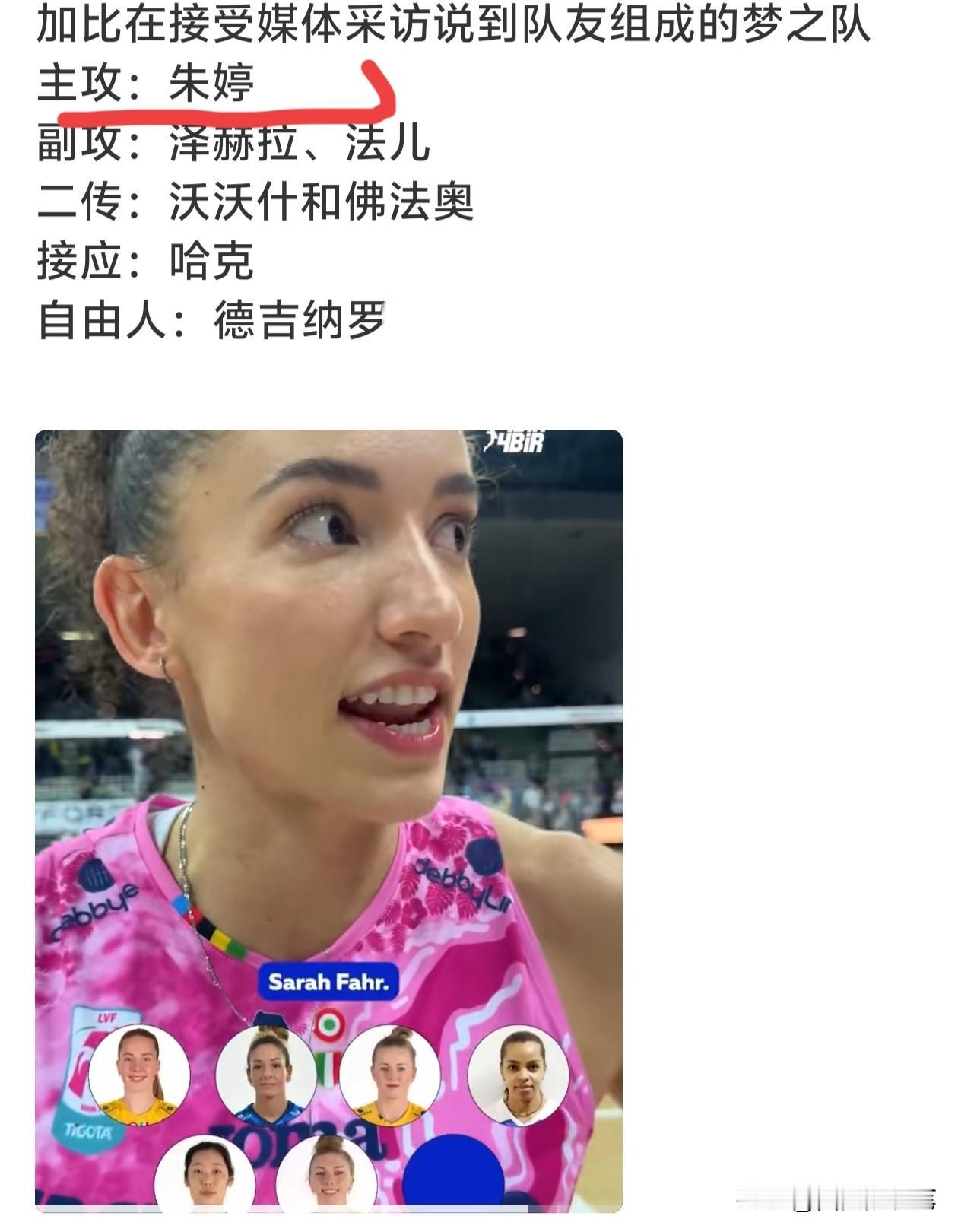 加比真是朱婷的好姐妹[呲牙] 此前媒体让加比选择心中的梦之队阵容,提起主攻时,她脸含微笑,眼中带光,不假思索地选择了队友朱婷,并称赞道:Zhu for sure, my dream to play with her。 加比,加比,必须为你点赞朱婷