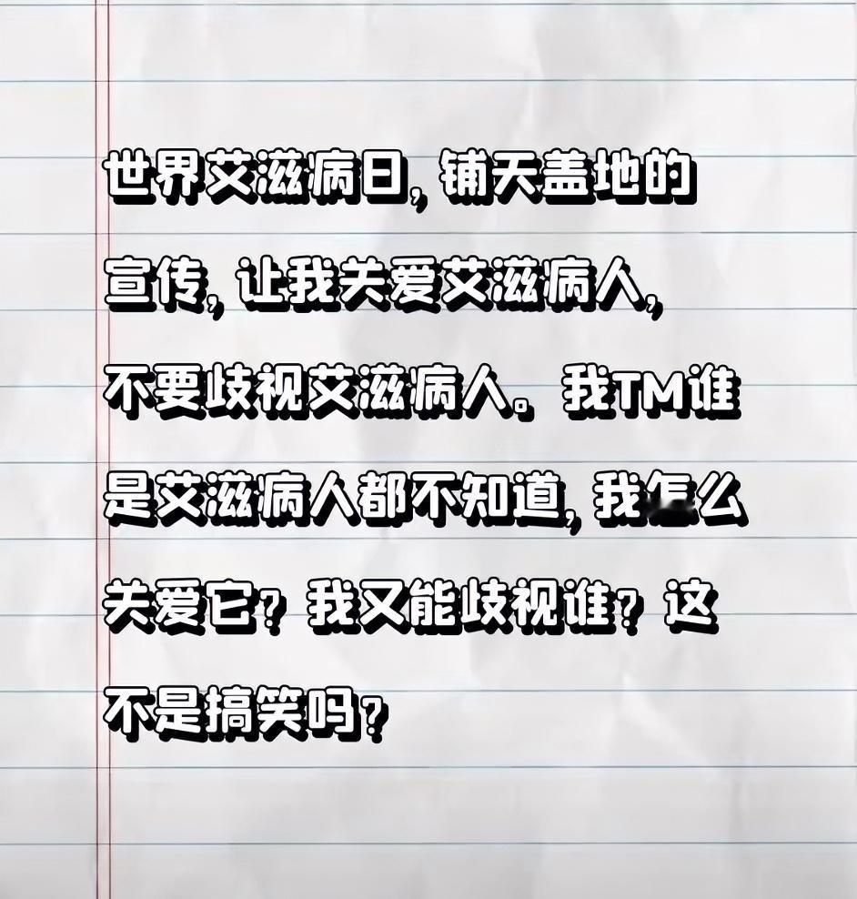 一个网友说:世界艾滋病日,铺天盖地的宣传,让我关爱艾滋病人,不要歧视艾滋病人。我TM谁是艾滋病人都不知道,我怎么关爱它?我又能歧视谁?这不是搞笑吗? 有网友回复:说到点子上了!强烈建议象扶贫一样,登记造册,必须一对一帮扶、关怀艾滋病人!我们不歧视艾滋病,需要带头人啊! 什么样的“艾滋病人”应该被同情——而不是“艾滋病人”都值得同情! 那些自己“不检点”而染上艾滋病的人——甚至还故意传染“艾滋病”的人,根本就不值得同情,而是“可恨”! 现在的艾滋病就是举国大害,我们在提倡关爱艾滋病,而艾滋病患者却有组织的传播艾滋病,这成了巨大的差别,我们不要为艾滋病的光环蒙蔽