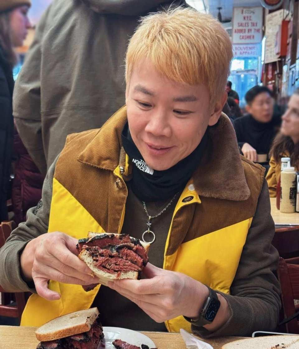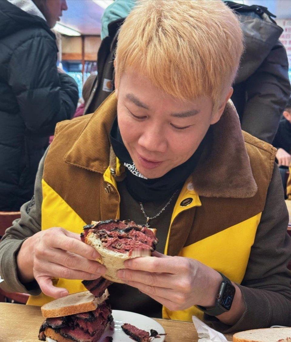 56岁陶喆在美国餐馆吃牛肉汉堡的图片,他染了黄毛,穿着黄棕相间外套。整张脸看起来奇怪,面相姨化,脂粉味好重啊。