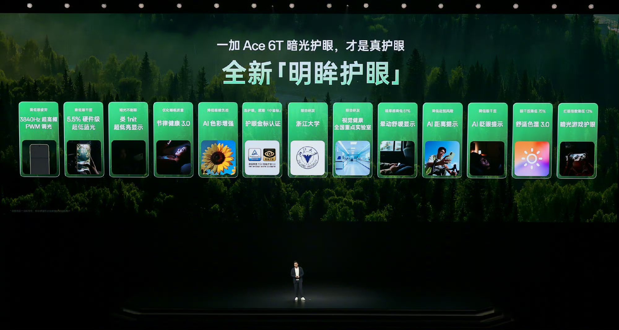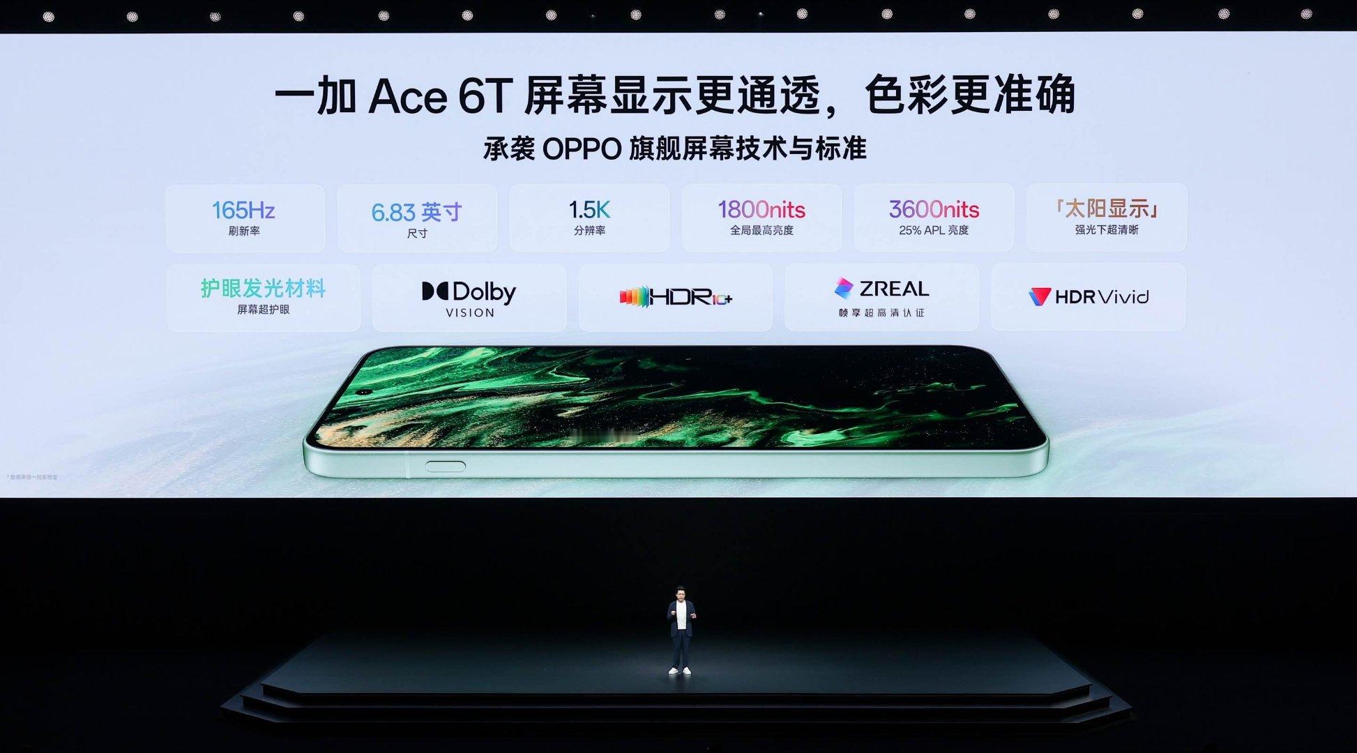 一加 Ace 6T 的屏幕参数:6.83 英寸 2800×1272 OLED 直屏,25% 窗口局部激发亮度 3600nit,支持 165Hz 刷新率(LTPS,1-120Hz 自适应刷新),330Hz 五指采样率,290Hz 十指采样率,3200Hz 瞬时触控采样率,支持全亮度 DC 调光+ 3840PWM 调光,超声波指纹识别,支持湿手触控 一加Ace6T搭载165Hz 超高刷电竞屏,高清超流畅,通透更护眼!【165Hz 极速高刷】支持 165 极速高刷,极致丝滑流畅。【承袭 OPPO 旗舰屏幕技术与标准】屏幕显示更通透,色彩更准确。【全新一代「明眸护眼」】三大硬件级护眼技术,低频闪 + 低蓝光 + 低亮度,均做到行业领先,同时通过行业最严苛护眼标准 ——「小金标」护眼认证。【旗舰超声波指纹】解锁速度更快,湿手油手解锁无忧,夜间解锁不刺眼。【旗舰同款配置】自研雨水触控 2.0 并支持手套触控你用过165hz手机打游戏吗一加ace6t新品发布一加ace6t一加ace6t原神神里绫华定制机