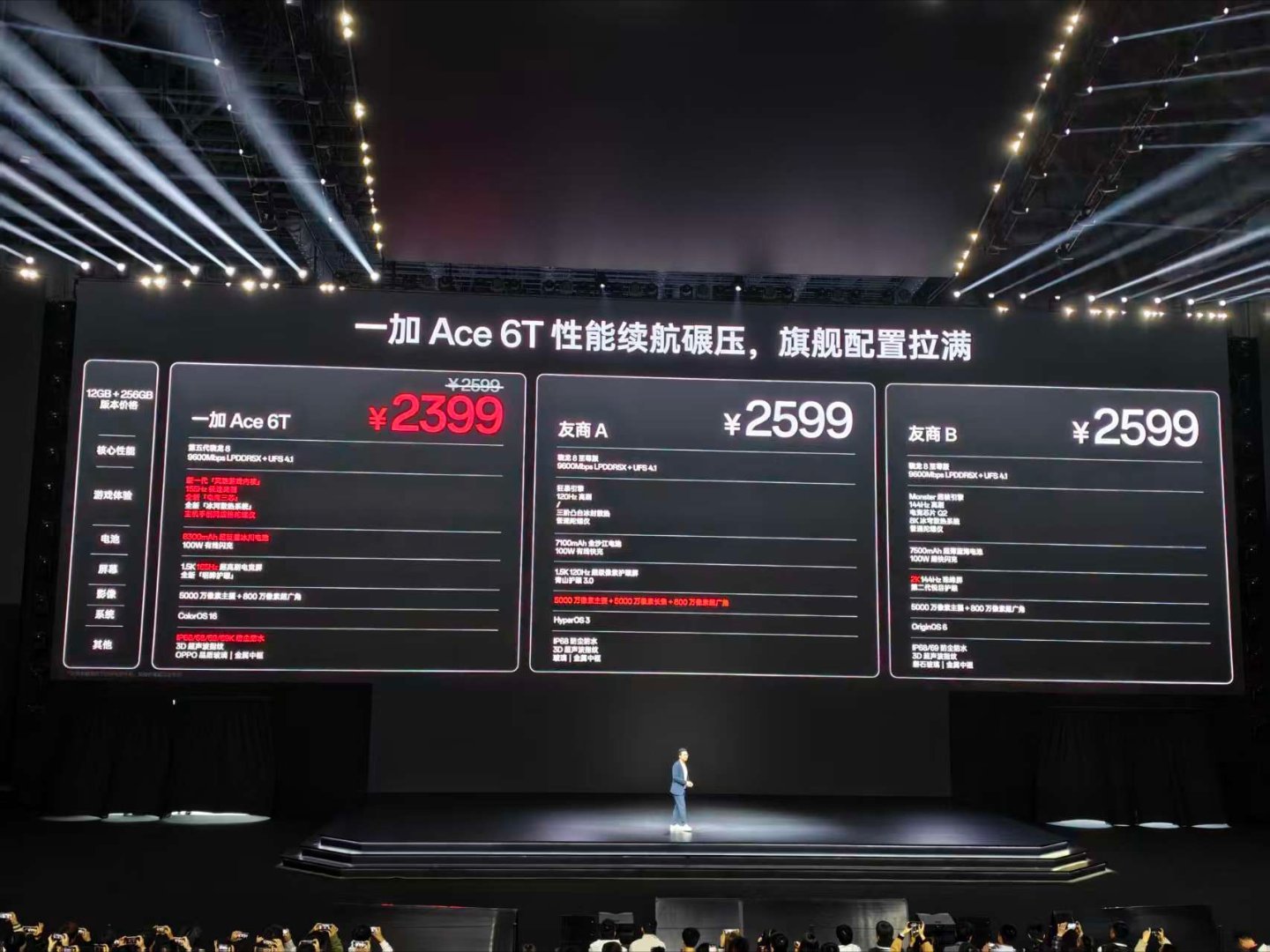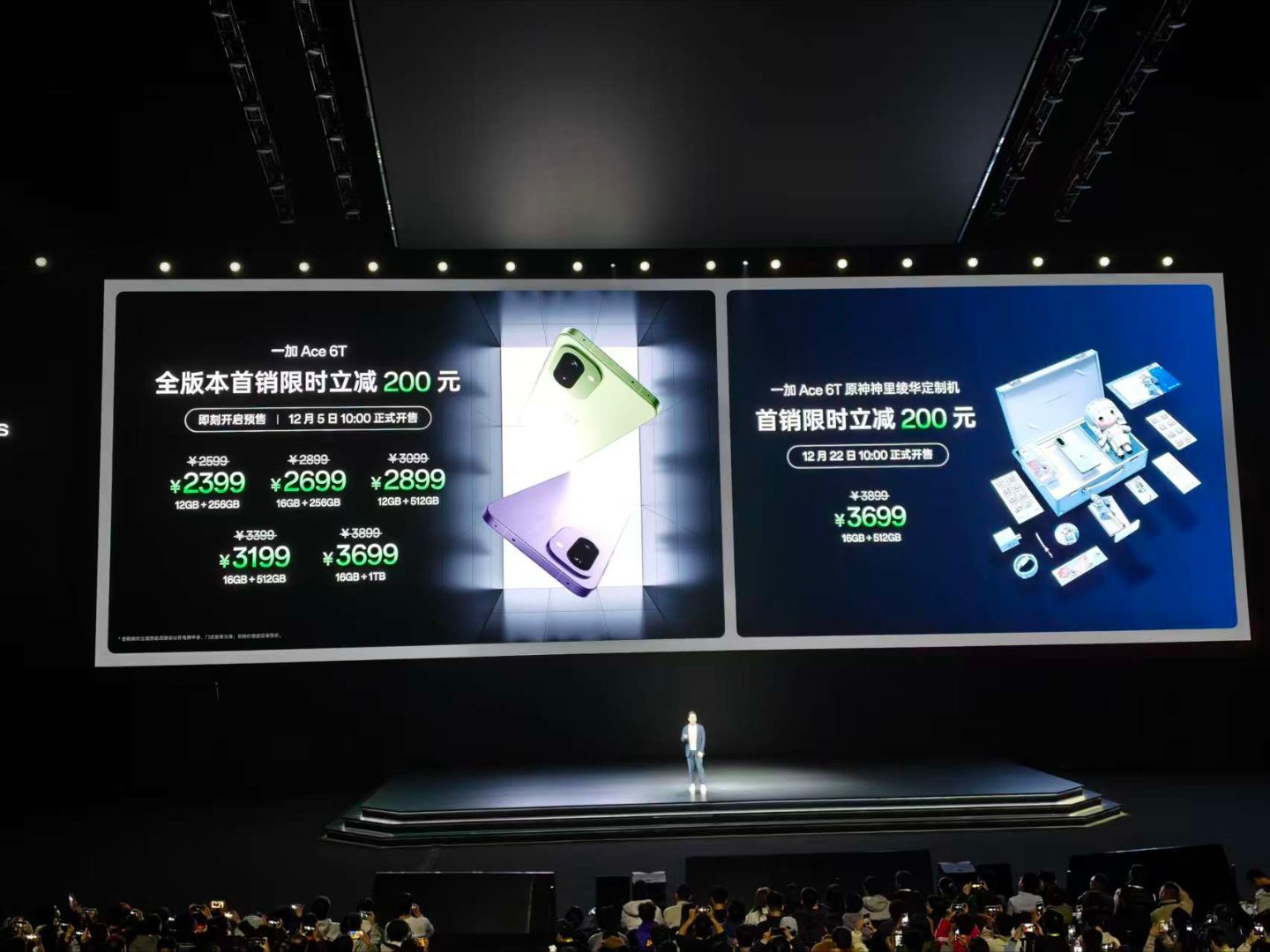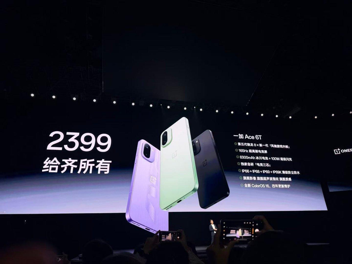 一加 Ace 6T 发布:12+256GB 首销: 2399 元、16+256GB 首销 :2699 元、12+512GB 首销 :2899 元、16+512GB 首销 :3199 元、16GB+1TB 首销: 3699 元,原神神里绫华定制版 :16+512GB 首销 :3699 元。大家觉得价格怎么样??配置参数:- 芯片:首发骁龙 8 Gen 5 移动处理平台(台积电 3nm N3P,CPU:2×3.8GHz Oryon-L + 6×3.32GHz Oryon-M,GPU:Adreno 829 1225MHz),LPDDR5X Ultra 内存(至高 9600Mbps),UFS 4.1 闪存,全新风驰游戏内核,冰河散热系统(散热总面积 43940mm²,冰河 VC),自研电竞网络芯片 G2、灵犀触控芯,自研 Display P3 屏幕芯片;- 屏幕:6.83 英寸 2800×1272 OLED 直屏,25% 窗口局部激发亮度 3600nit,支持 165Hz 刷新率(LTPS,1-120Hz 自适应刷新),330Hz 五指采样率,290Hz 十指采样率,3200Hz 瞬时触控采样率,支持全亮度 DC 调光+ 3840 PWM 调光,超声波指纹识别,支持湿手触控,OPPO 晶盾玻璃;- 相机:前置 16MP(索尼 IMX480),后置 50MP 主摄(索尼 IMX906,OIS,1/1.56")+ 8MP 超广角(索尼 IMX355)双摄;- 续航:8300mAh 冰川电池(仿生技术球形硅碳负极材料),100W 快充,兼容 36W PD、55W PPS,支持旁路供电;- 其他:厚 8.3mm(电光紫厚 8.1mm),重 216g(电光紫重 211g、掠影绿 217g),闪速黑、电光紫、掠影绿 3 款配色,丝绸玻璃后盖(电光紫玻纤),铝合金金属中框,支持 Wi-Fi 7、蓝牙 5.4、NFC、红外遥控、超线性立体声双扬声器,游戏手柄级陀螺仪(200Hz 采样率),IP66 & IP68 & IP69 & IP69K 防尘防水,搭载基于 Android 16 的 ColorOS 16 系统。一加ace6t原神神里绫华定制机一加ace6t原神定制机一加ace6t